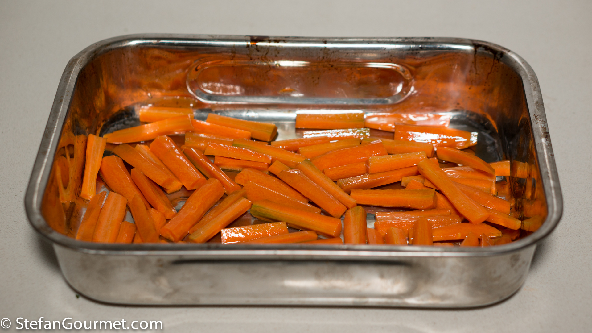 Roasting the carrots brings out their flavor. Preheat the oven to 225C/440F. Peel the carrots, cut them in quarters lengthwise, and in pieces that are roughly the size of the pasta. (Click here to read about matching pasta shapes with pasta sauces.) Put the carrots in an oven dish and toss them with some olive oil until they are coated with the oil.