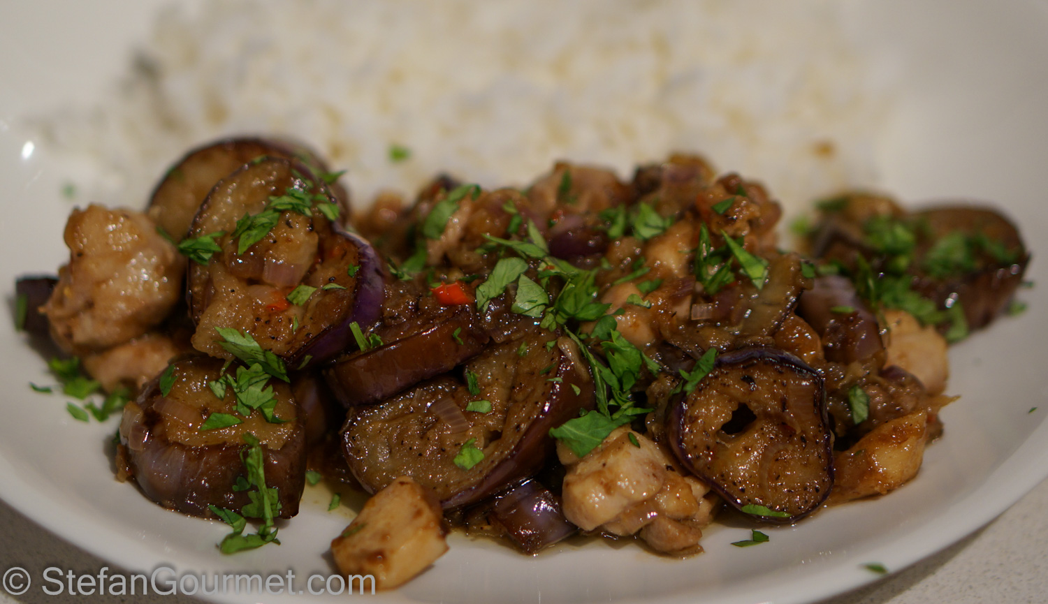 Chinese eggplants are thinner, have a milder flavor, and a more smooth texture than regular eggplants. Combined with chicken, ginger, soy sauce, and chili, it makes for a great dish.