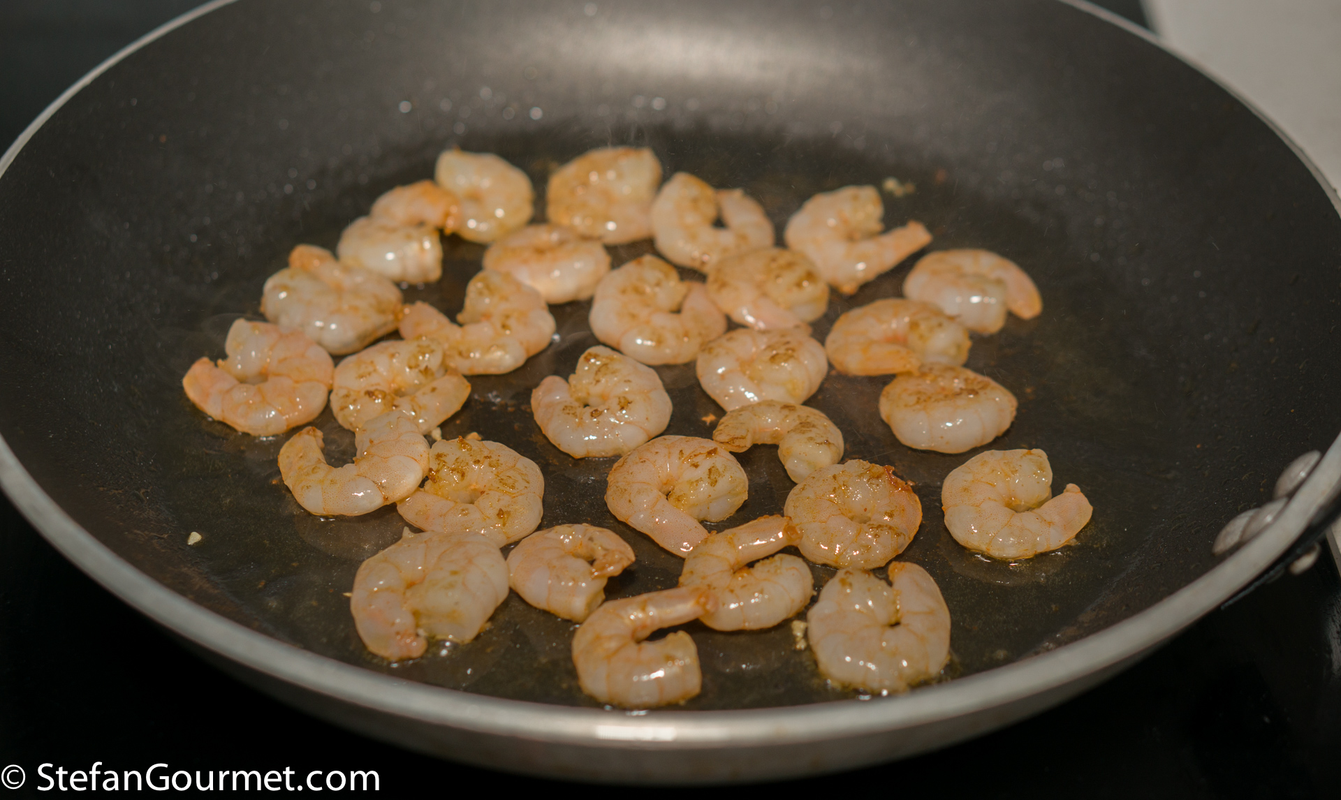 Meanwhile, cook the shrimp in a non-stick frying pan until golden on both sides, about 1 minute per side. Do not overcook the shrimp, it should just be cooked through.