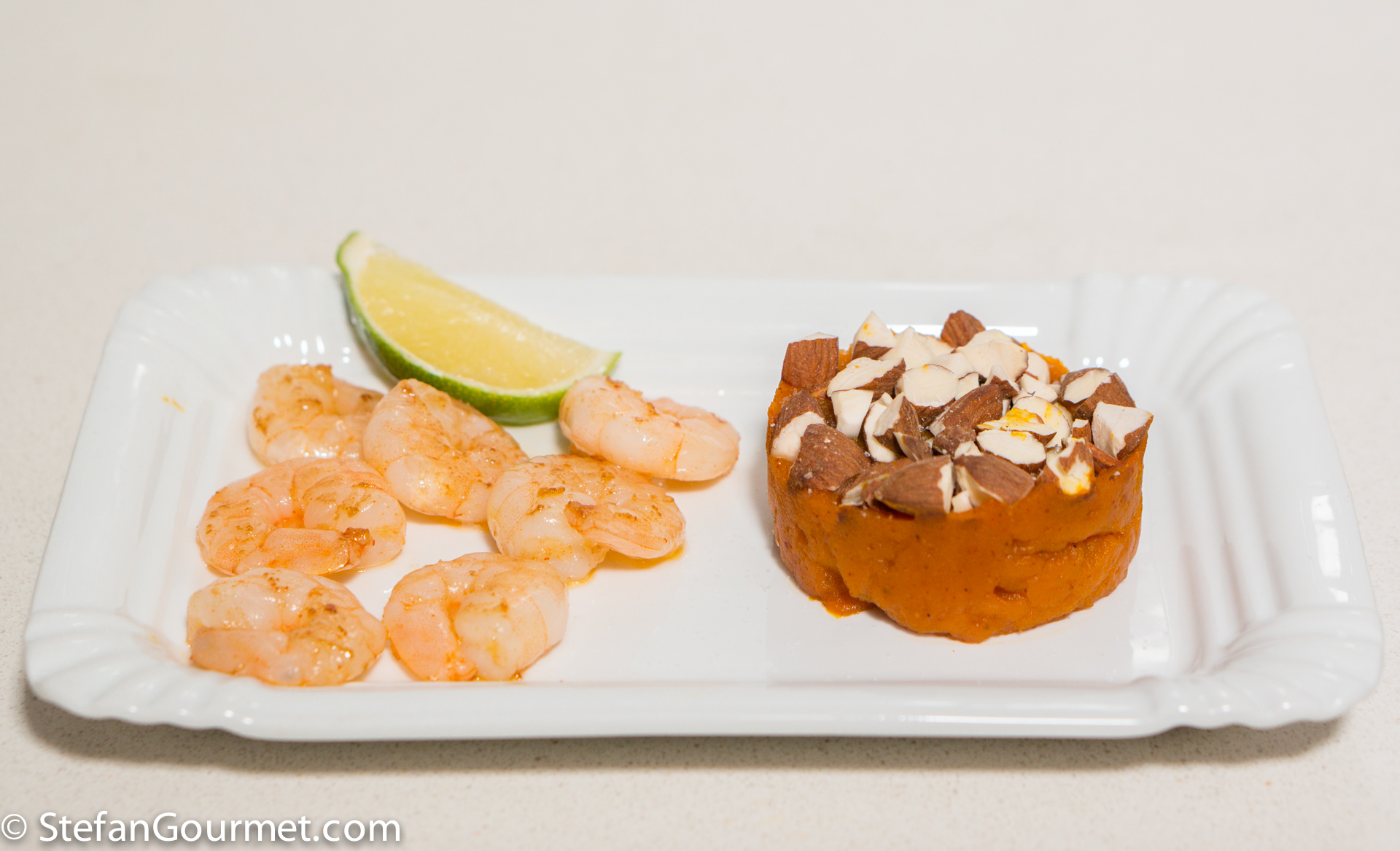 I always like it when I get requests for a dinner party, because it makes it easier to choose what to make. In this case, the request was something with shrimp and garlic. Because of the season I looked for autumn flavors that would work well with shrimp and garlic. As shrimp are earthy and sweet, pumpkin seemed a good choice. Especially since I still had some pumpkin puree in my refrigerator leftover from making bacon-wrapped scallops with pumpkin. To add some crunch that would work well with both shrimp and pumpkin and stay within the autumn theme, I decided to include almonds. And finally just a bit of lime and chilli pepper to add some excitement. The dish turned out well, it was delicious and well appreciated. Here’s what I did…