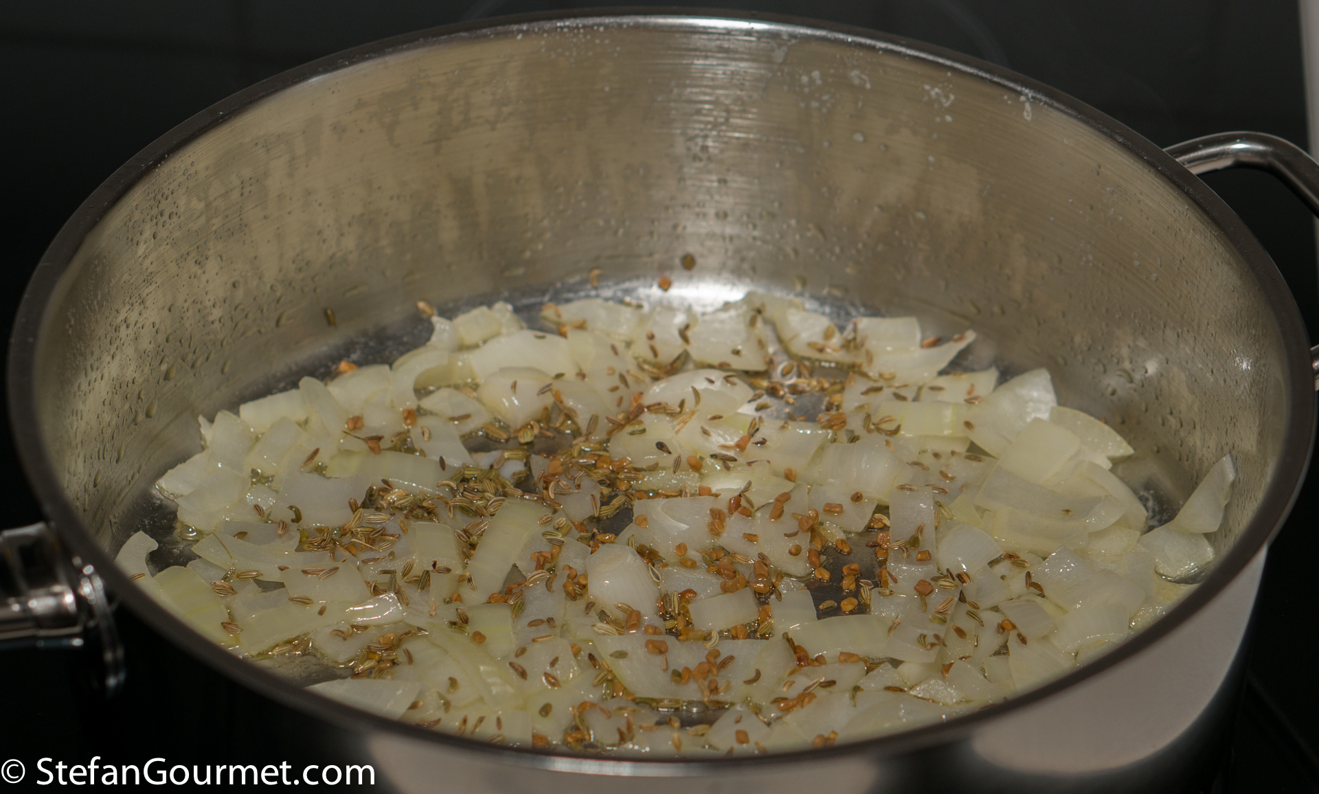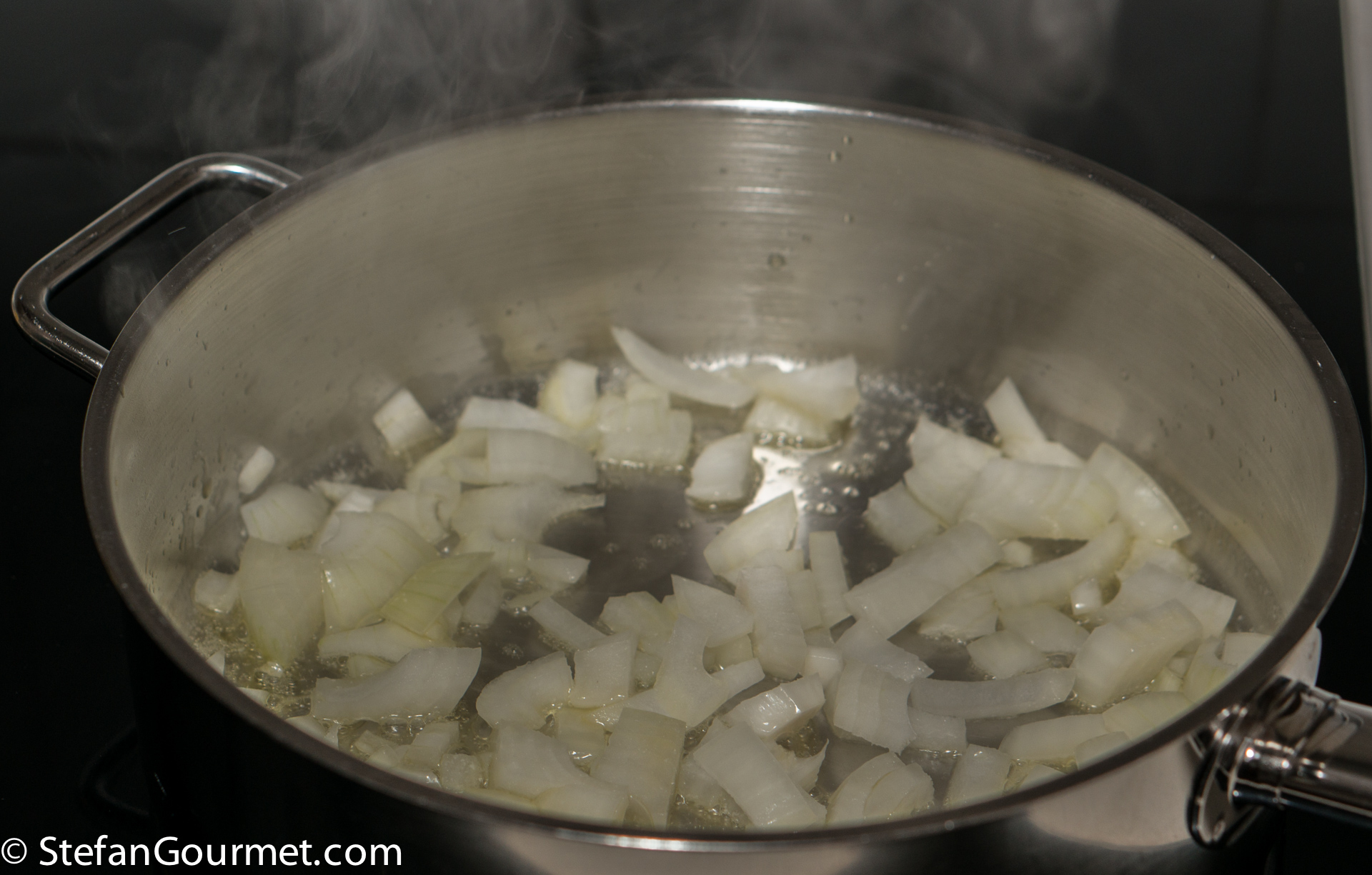 Heat 2 tablespoons of ghee in a frying pan and add a chopped onion. Season with salt.