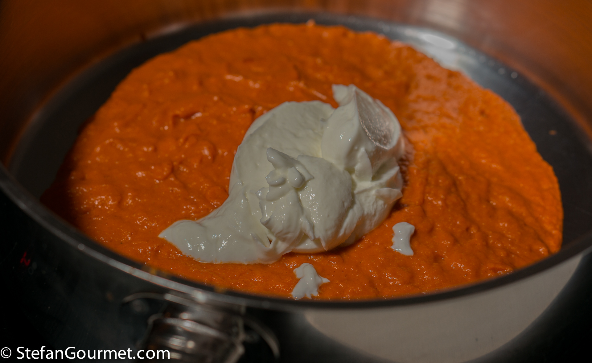 Clean the pan and return the smooth tomato mixture to the pan. Add 100 grams of yogurt (or cream).