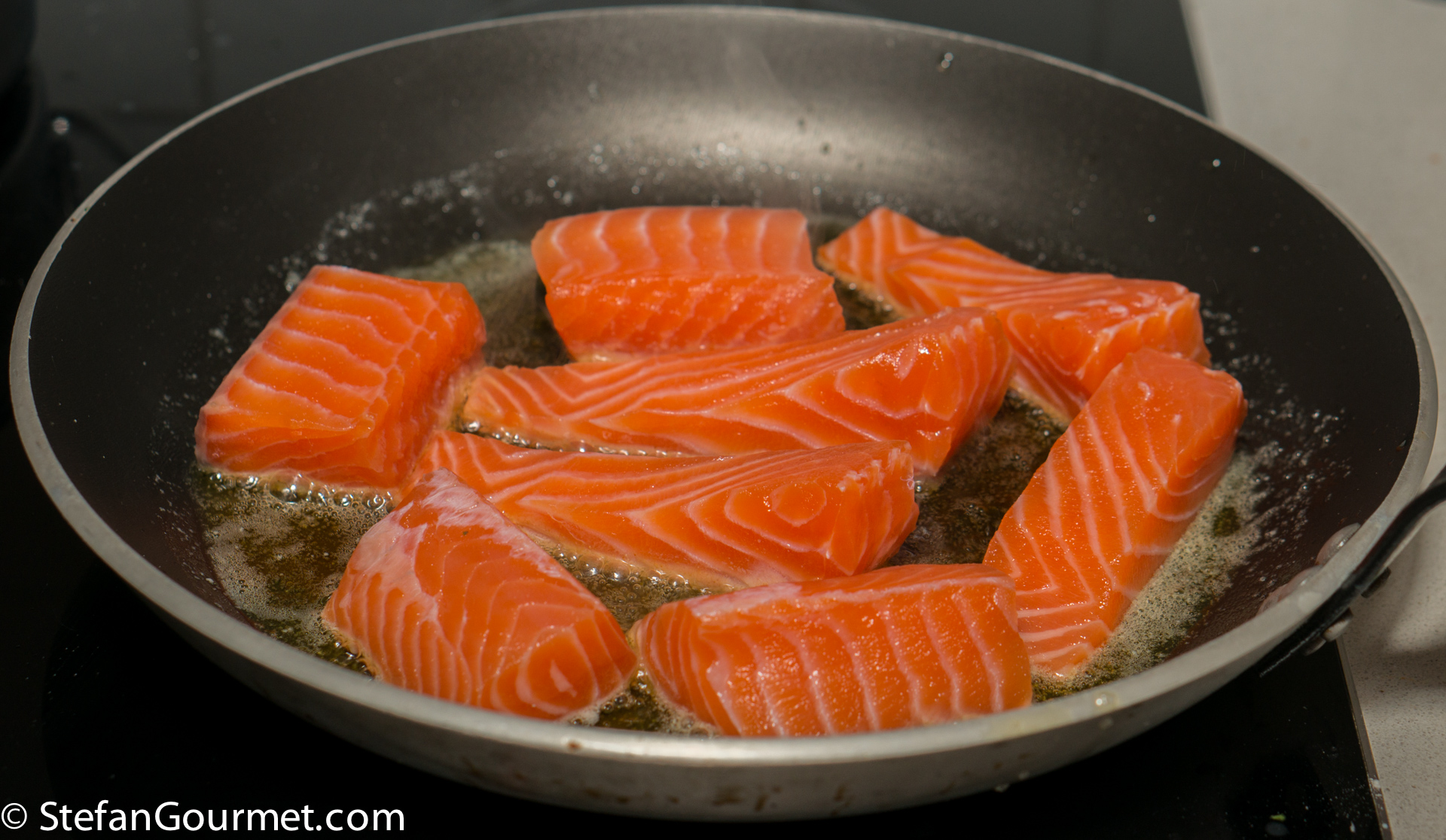 Cut 600 grams of salmon into serving pieces and season on all sides with 1 1/2 tsp of salt. Cover and refrigerate for a couple of hours (but at least 45 minutes) to allow the salt to penetrate the salmon. This doesn’t only season it, but firms up the salmon and helps to keep it juicy.