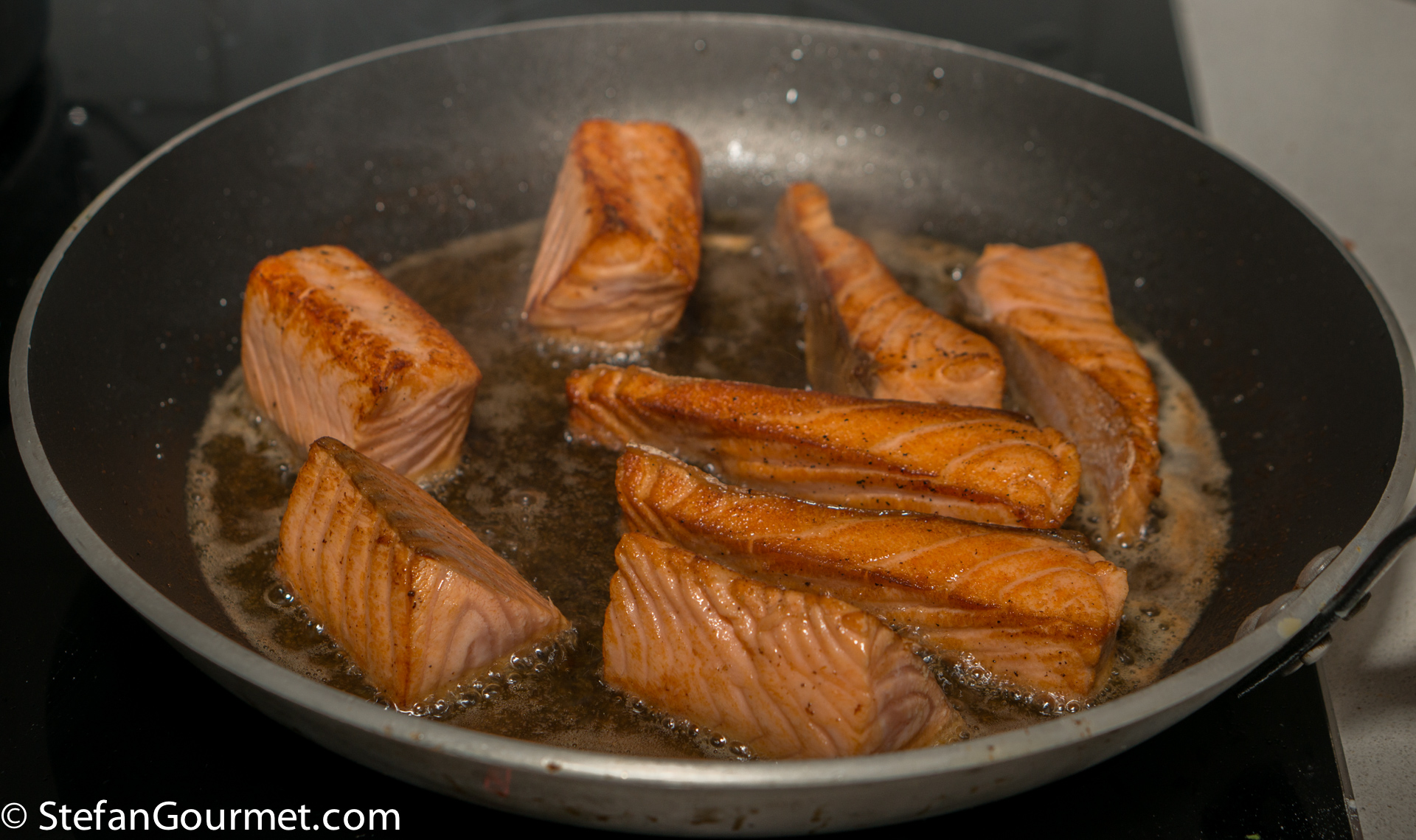 Stir gently to coat the salmon with the gravy on all sides, then turn off the heat. Cover and allow the heat of the gravy to cook the salmon through, about 5 minutes depending on the thickness of the salmon pieces. The salmon should be just cooked through so that it will remain succulent instead of drying out.