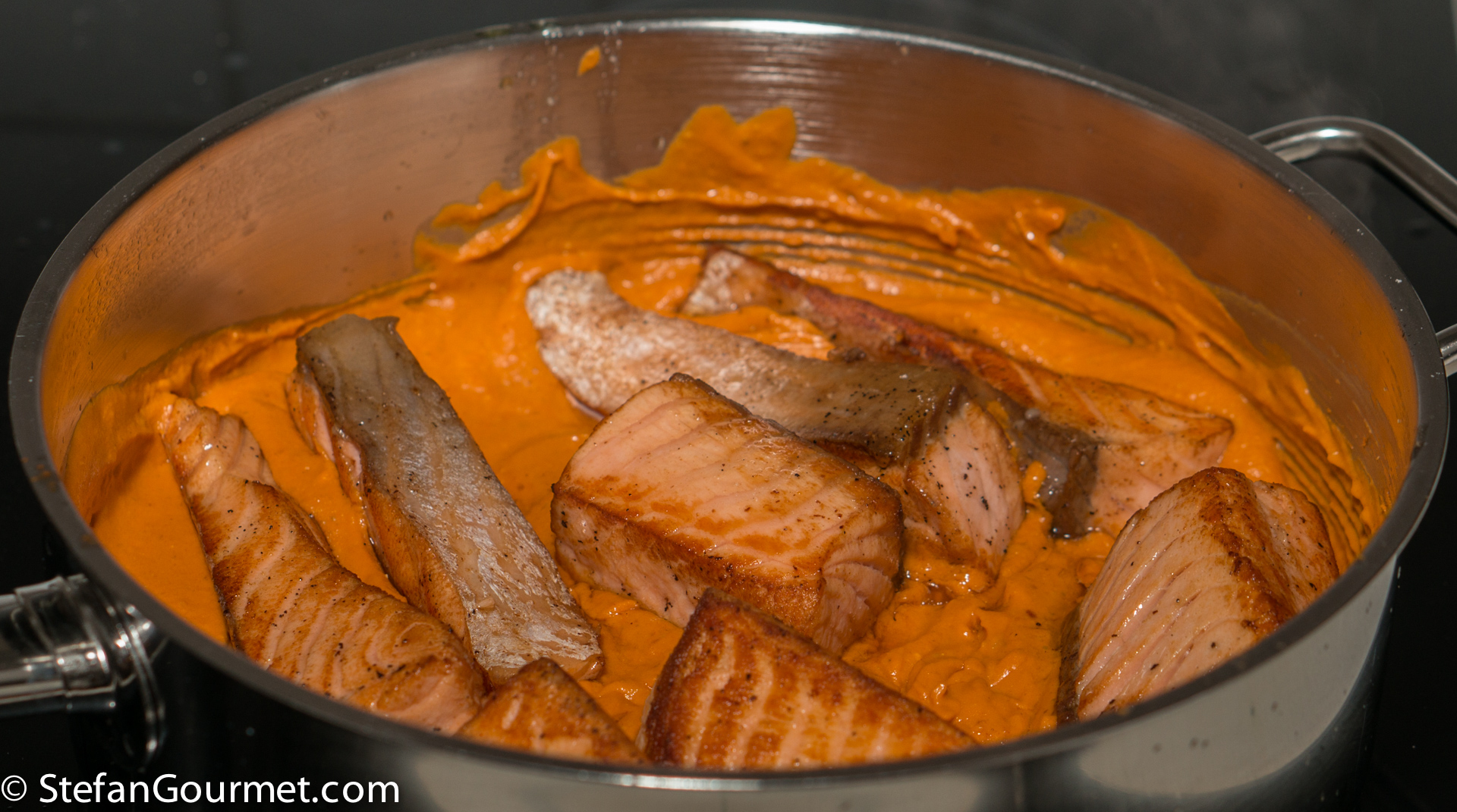 Add the salmon to the tomato gravy.