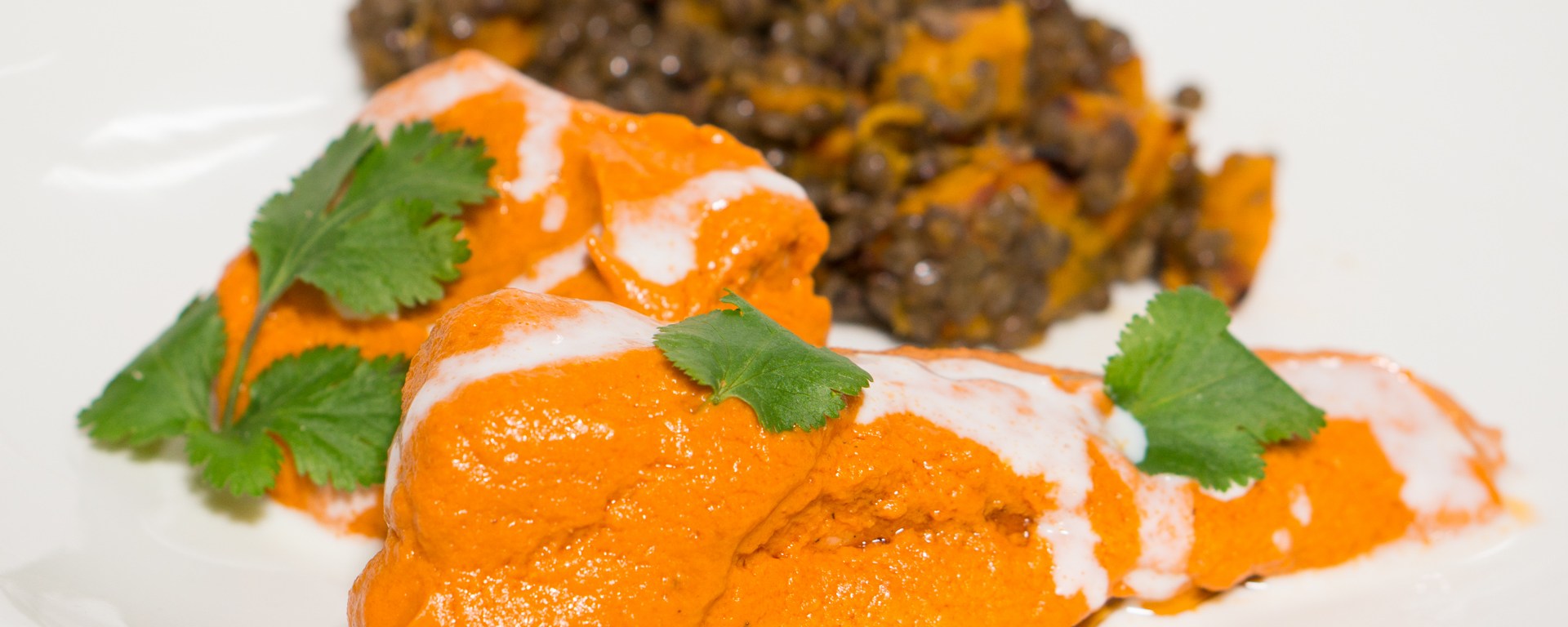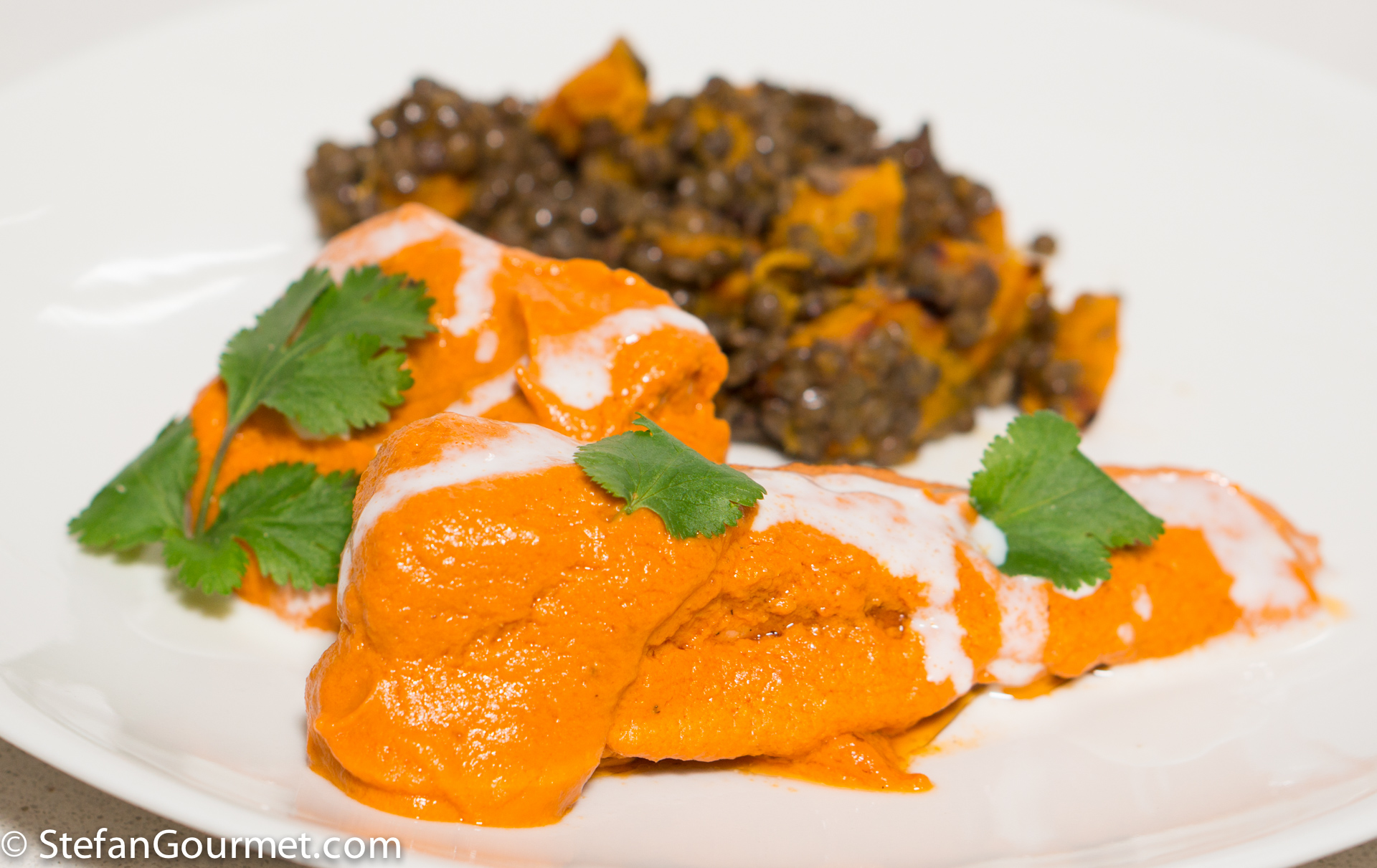 Serve the salmon covered in tomato gravy. Garnish with drizzled cream and cilantro. (Because I wanted to give my stomach some rest after eating spicy food for breakfast, lunch, and dinner for three days in a row, I served the salmon as a main dish with a side of roasted pumpkin and lentils, dressed with some melted ghee.)