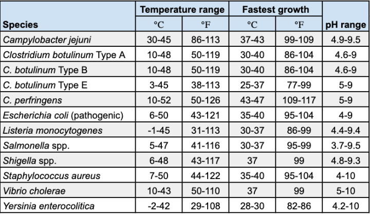 The table above shows at what temperatures and acidity bacteria can reproduce.