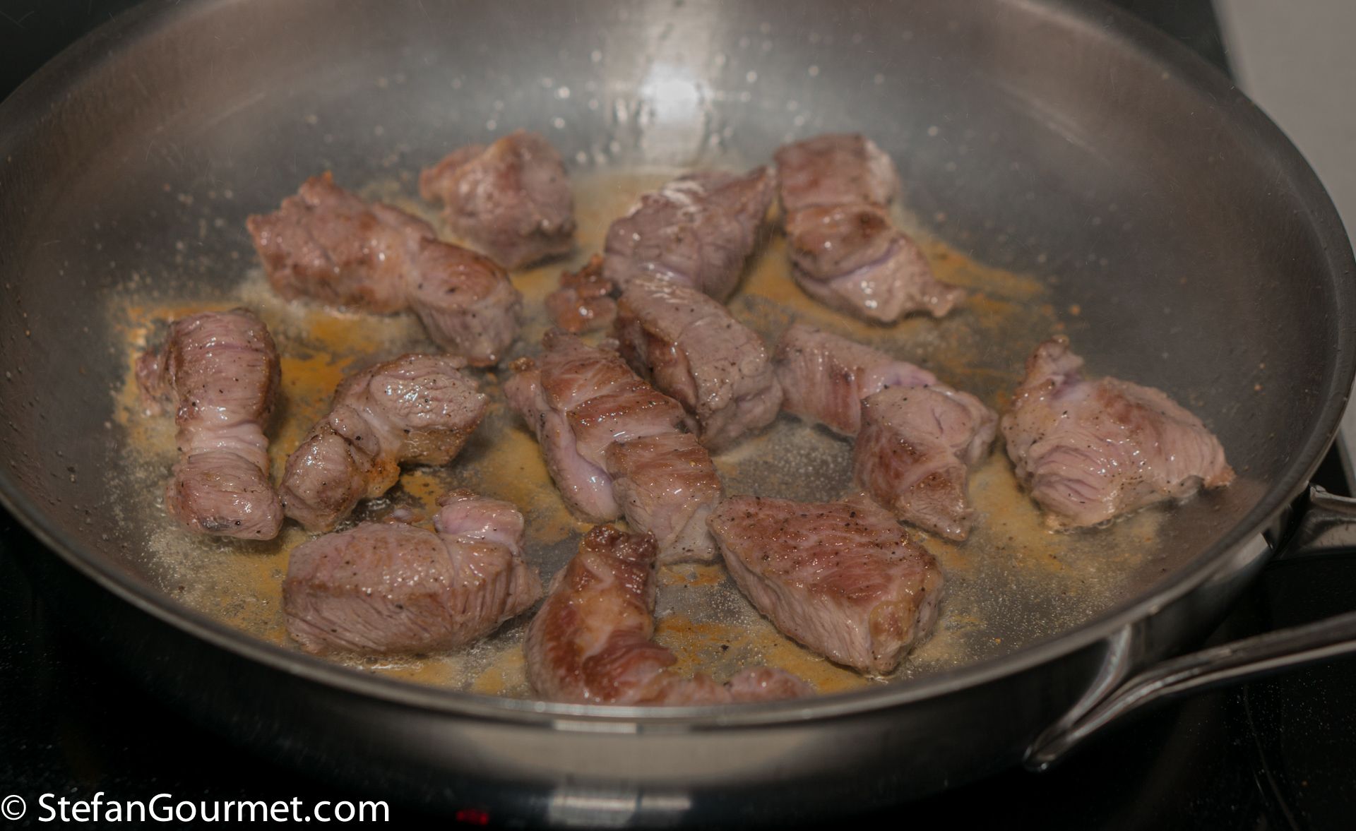 Brown the meat in 2 tablespoons of clarified butter on all sides, then set aside.