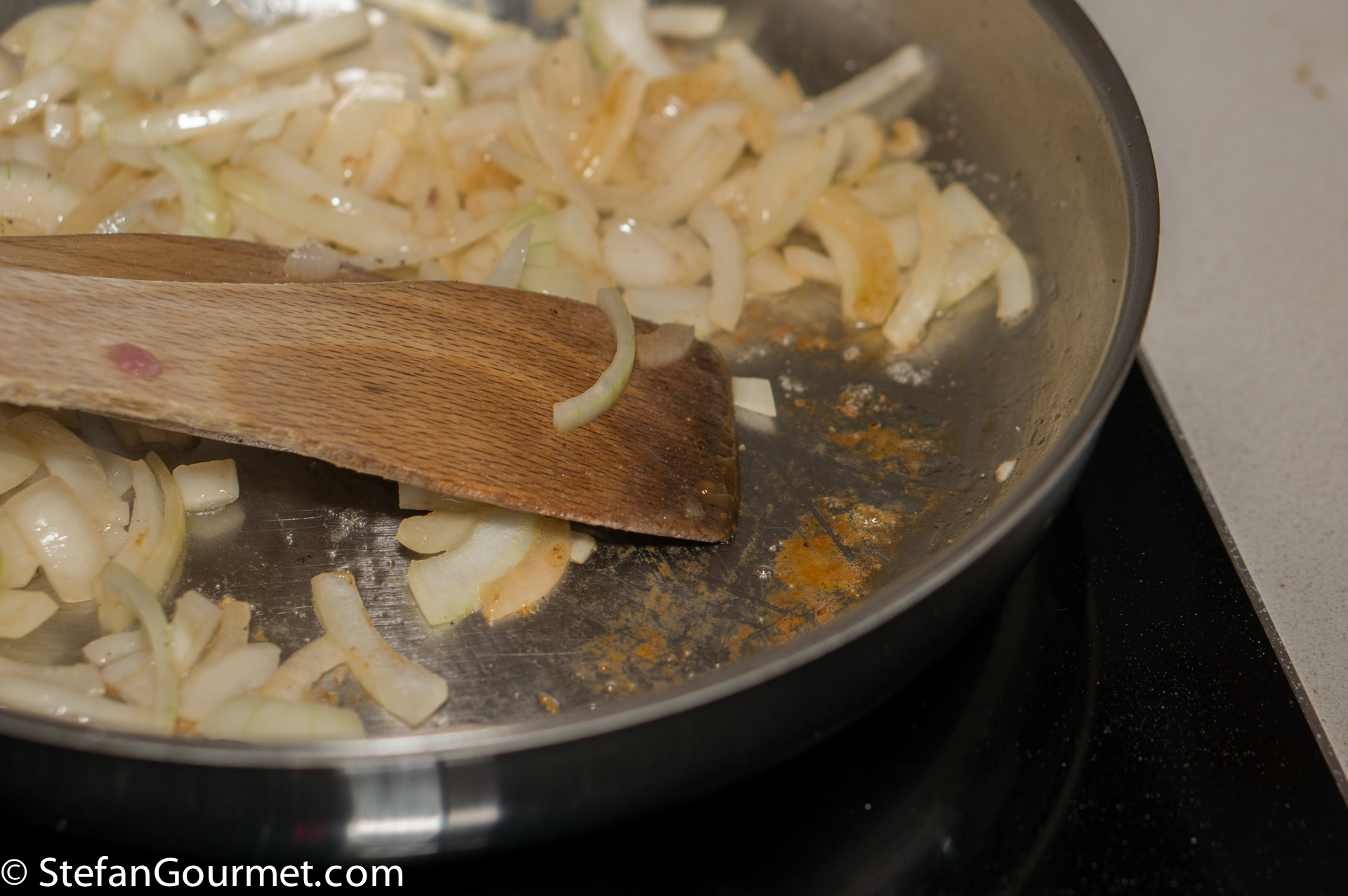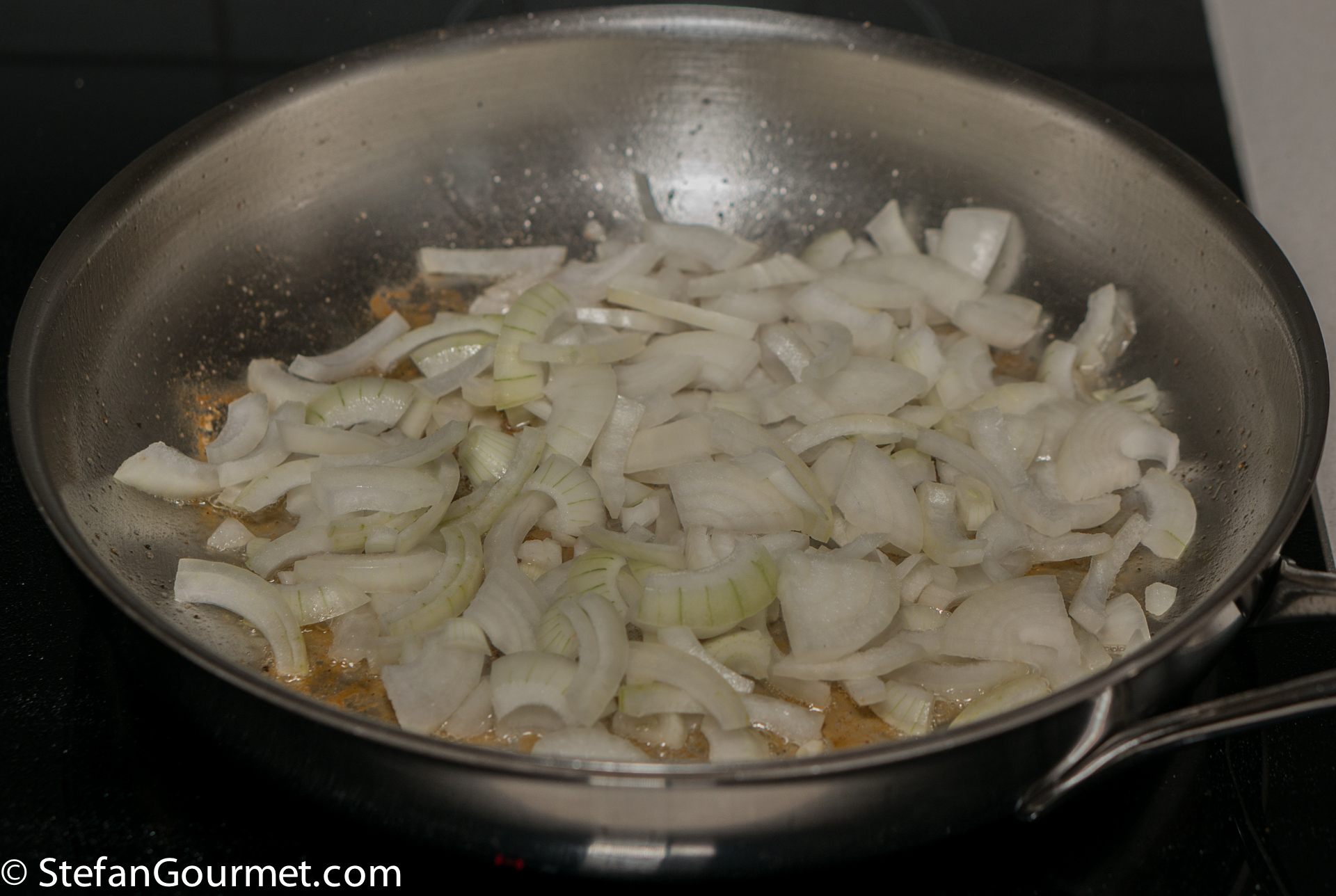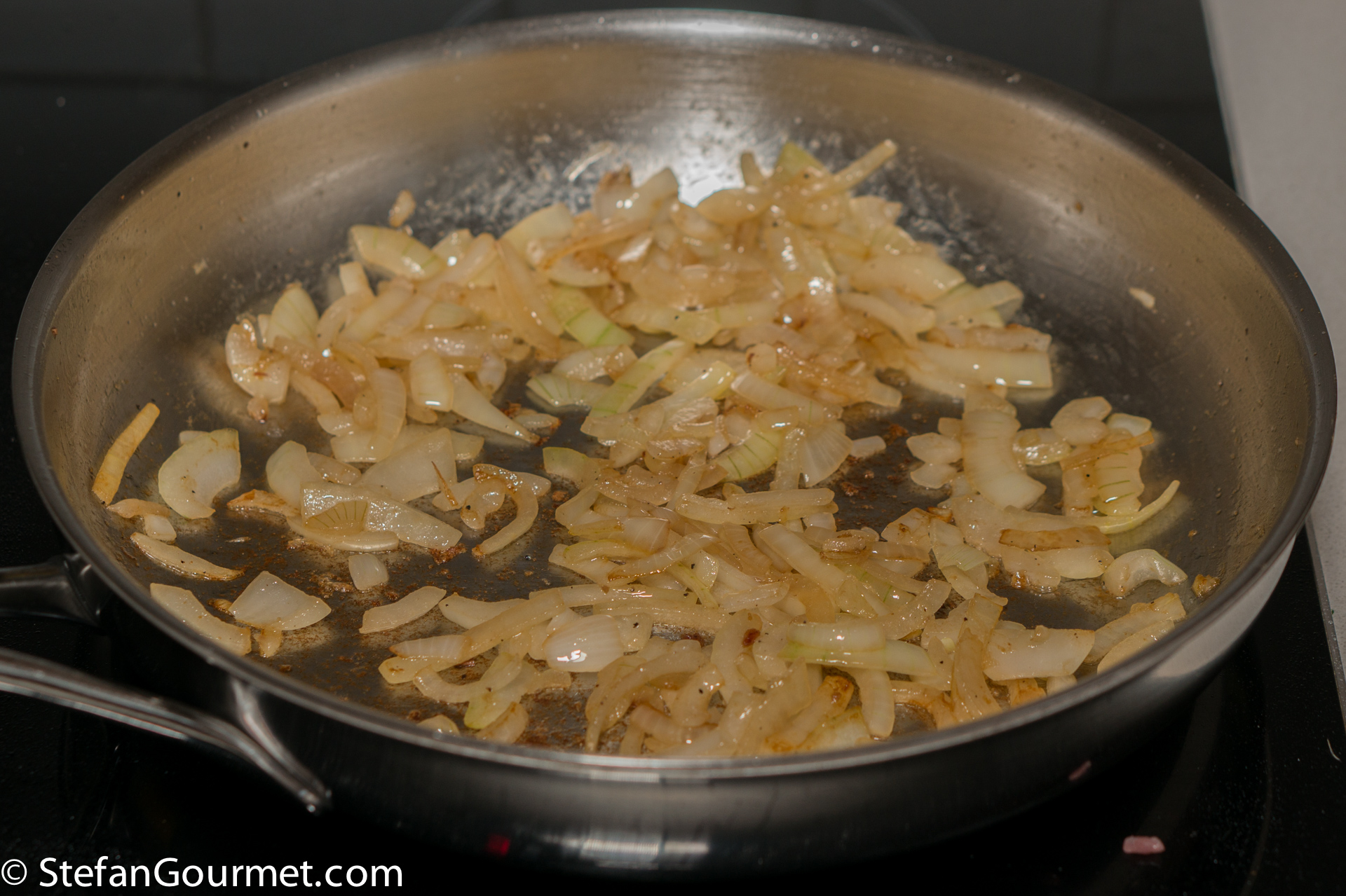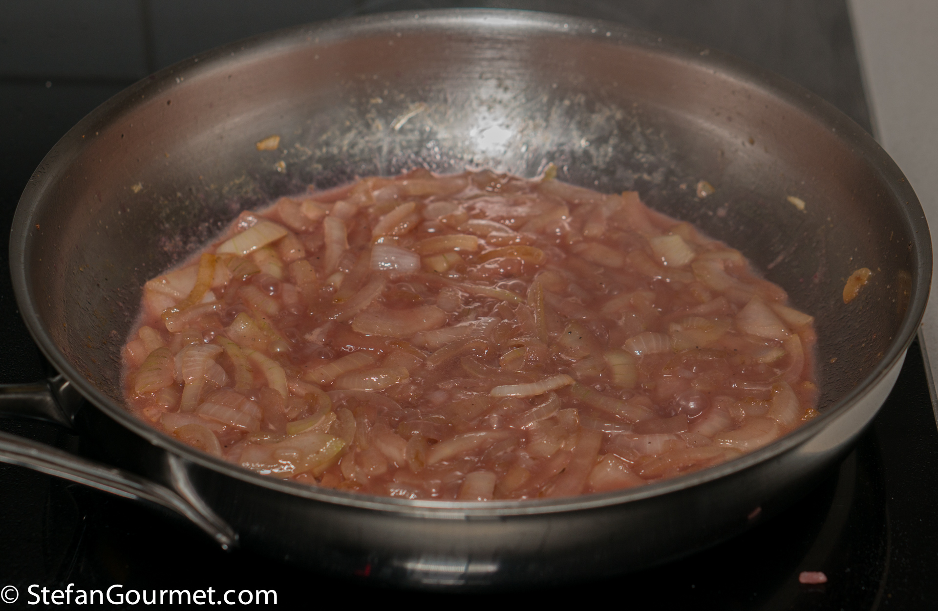 Cook the onions over medium heat, stirring, and making sure to include all the nice browned bits from the bottom of the pan.