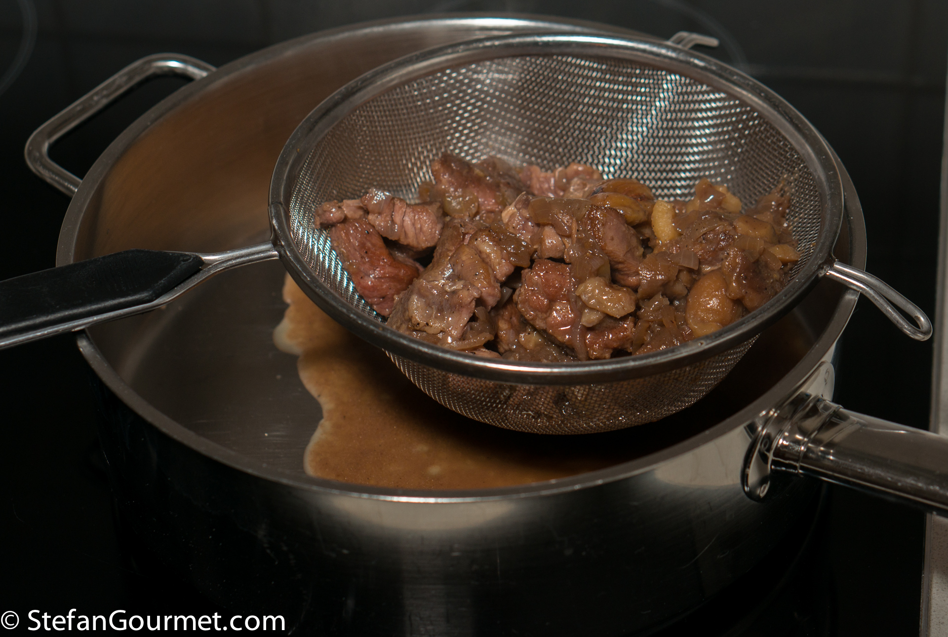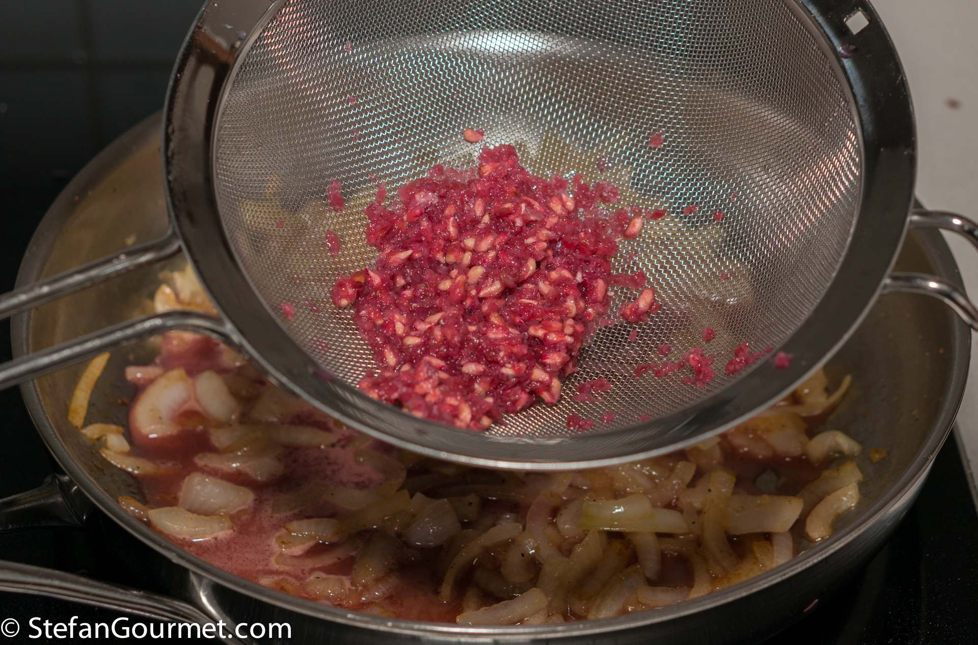 …and filter the resulting juice/puree with a sieve to add pomegranate juice directly into the pan with the onions.