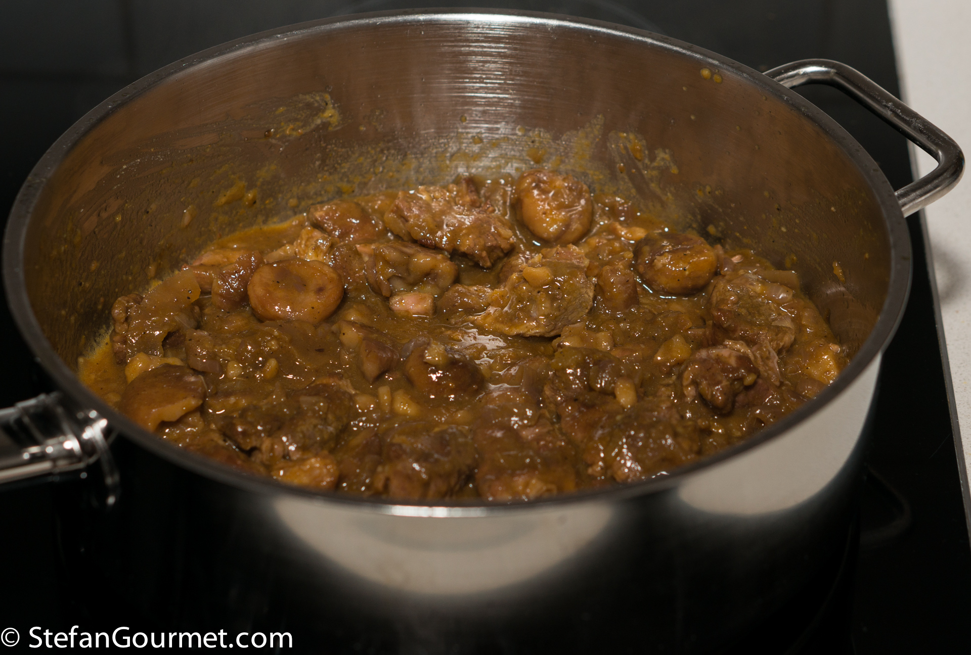 If not cooking sous-vide, at this point add back the lamb and cook over low heat, covered, until almost tender. Add 100 grams of cooked chestnuts, cook for 10 minutes, then add the saffron water and cook for a final 5 minutes.