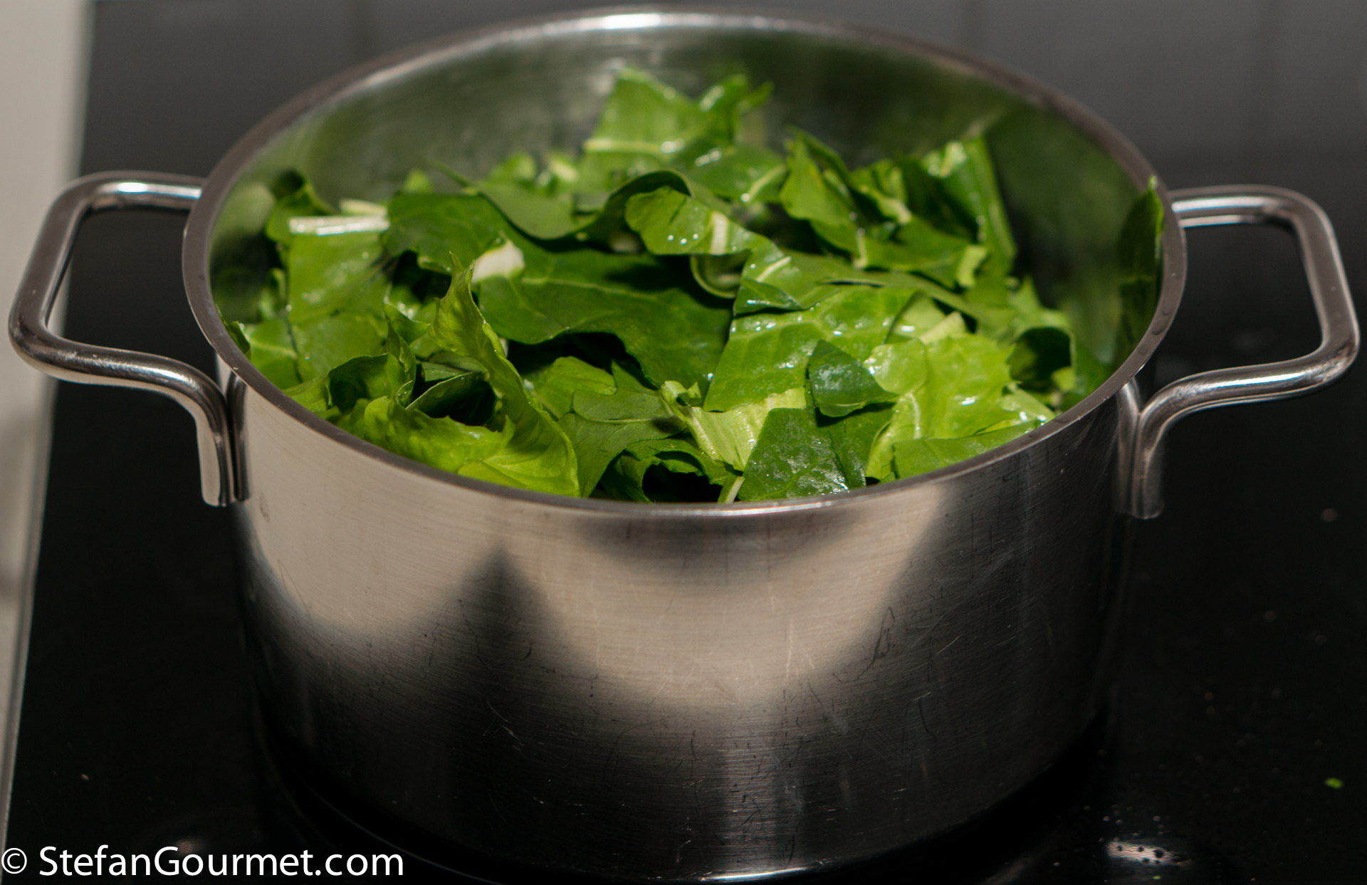 Put 200 grams of greens in a saucepan with the water that clings to them. Cover and bring to a boil.