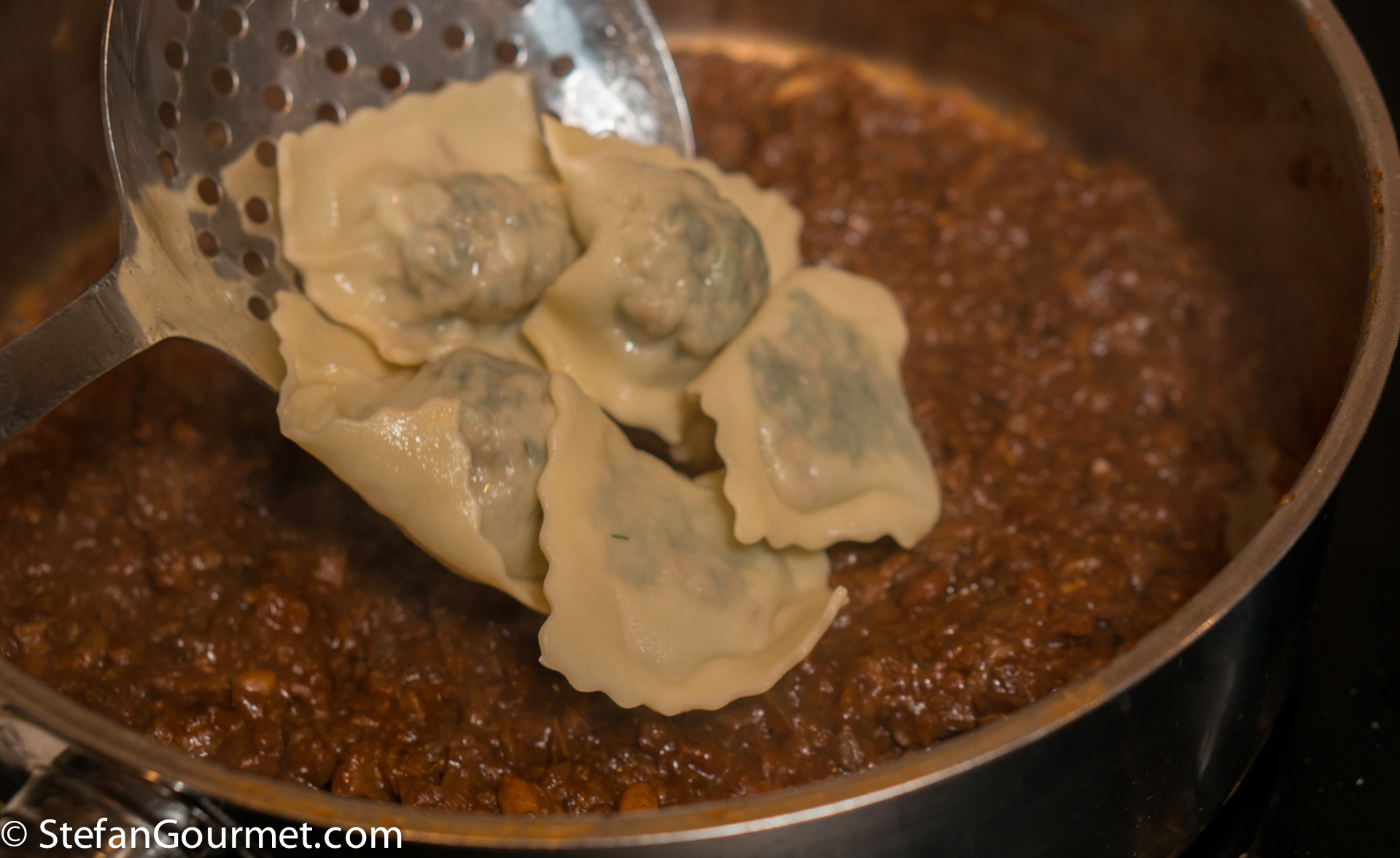 Cook them for a couple of minutes, then transfer them to the pan with the warm sugo using a slotted spoon.