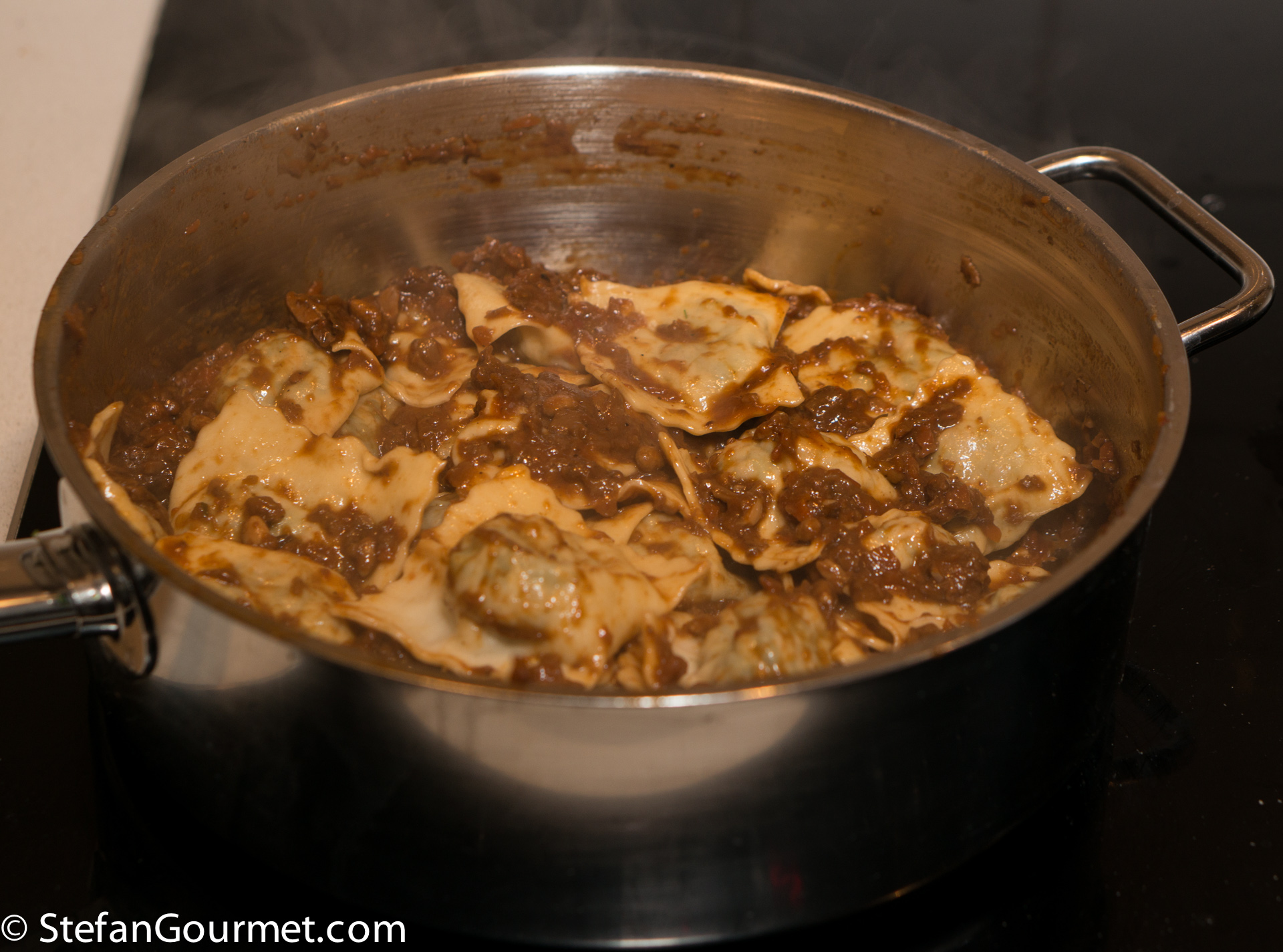 Gently reheat the sugo and bring a large pot of water to a boil. When the water boils, add salt and the ravioli.