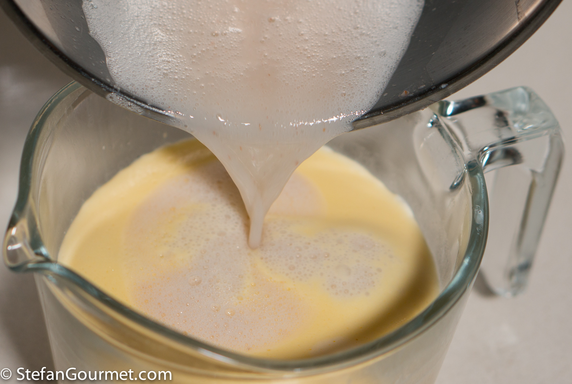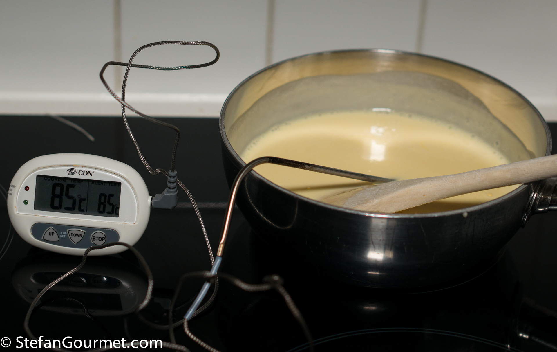 Transfer this mixture to a saucepan and heat over medium heat, stirring constantly, to a temperature of 85C/185F. Then turn off the heat. You have now made a custard that would be called crème anglaise if you also included vanilla. This step doesn’t only cook the egg yolks so you don’t have to worry about salmonella, but it also binds the sugar with the cream for a better texture of the ice cream.