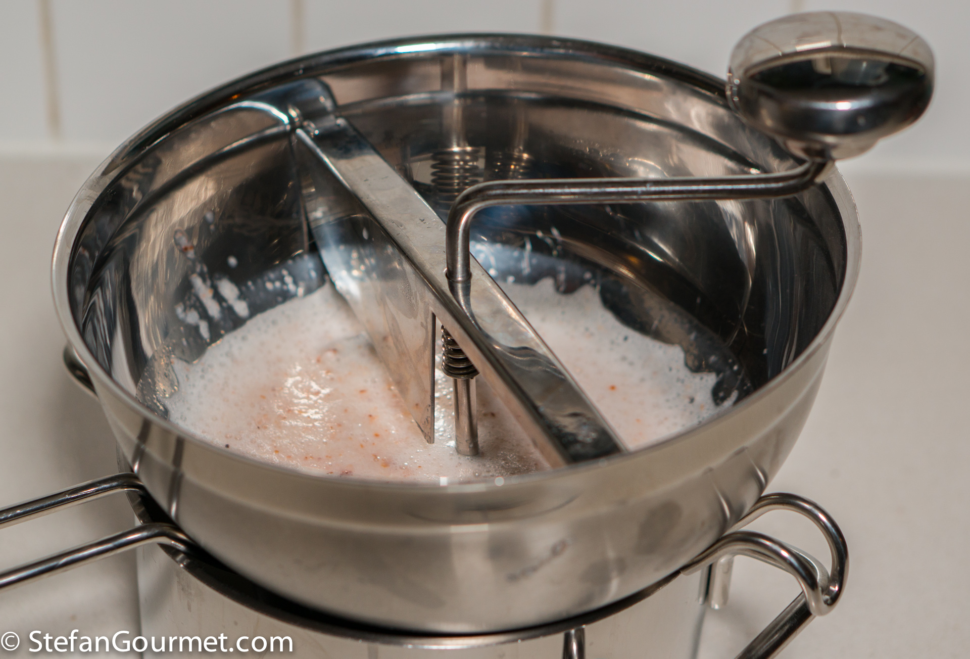 I wish you all a happy and healthy 2017 with delicious food and wine. As my first contribution to this, I present to you homemade lychee ice cream. Lychees are a  tropical fruit with a complex delicious aroma and flavor. When turned into ice cream, they become a very special treat. It is a bit of work to peel them and remove the seeds to produce the fresh lychee juice needed to make this recipe, but believe me, it is worth it! Most of the complex delicious aroma will be gone when you use store-bought lychee juice for this (which in most cases isn’t 100% lychee juice in the first place).