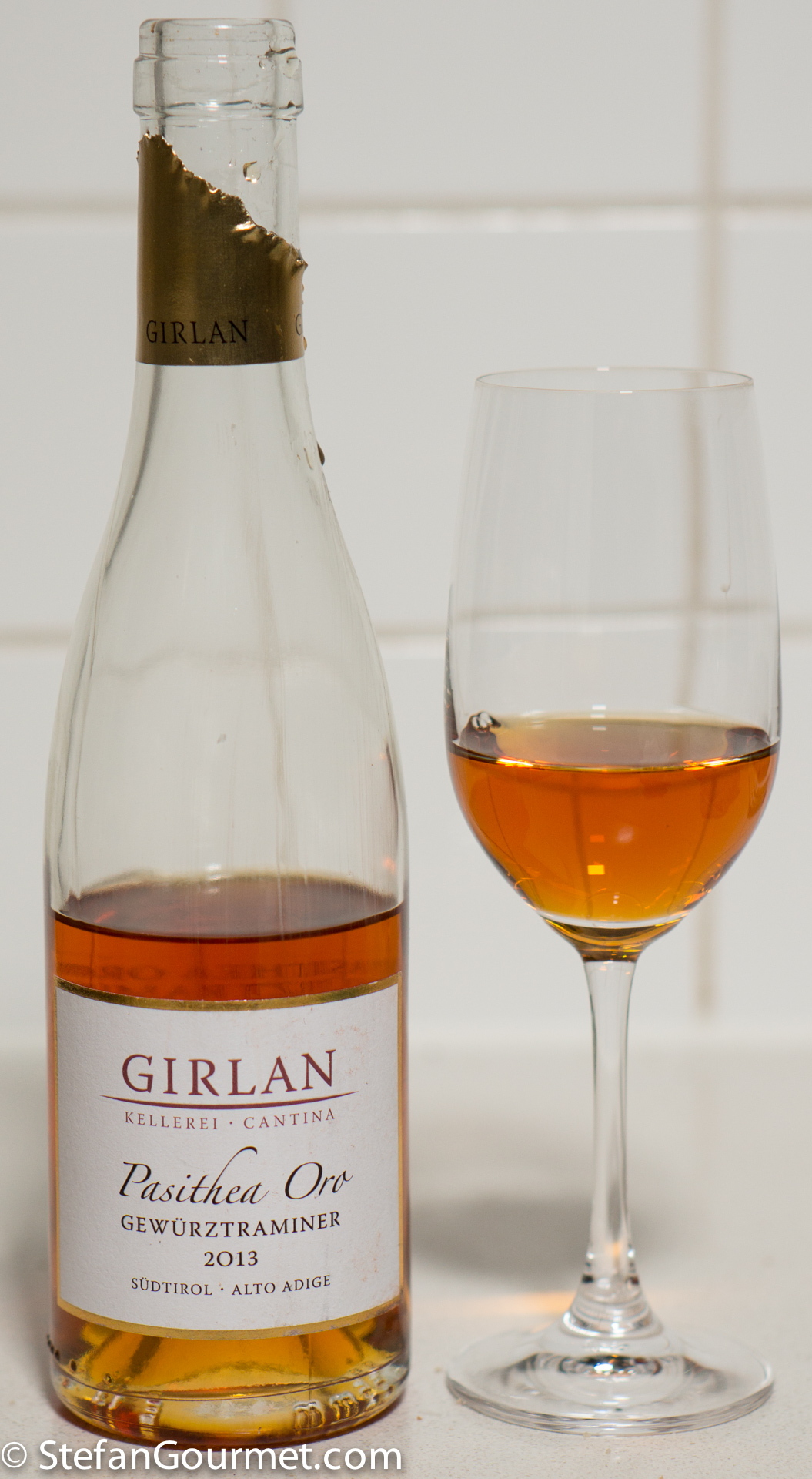 Gewurztraminer is famous for having aromas of lychees, so a sweet wine made from this grape variety is a great choice that will work very well as long as it is indeed very sweet. Dry wines from gewurztraminer may seem sweet, but they only smell sweet and are in fact dry. They would be terrible with this ice cream. So look for late harvest, vendanges tardives or passito, like this Pasithea Oro from Girlan in Alto Adige, Italy. It was outstanding together with the ice cream, because not only the aromas but also the acidity worked very well with the natural acidity of the lychees.