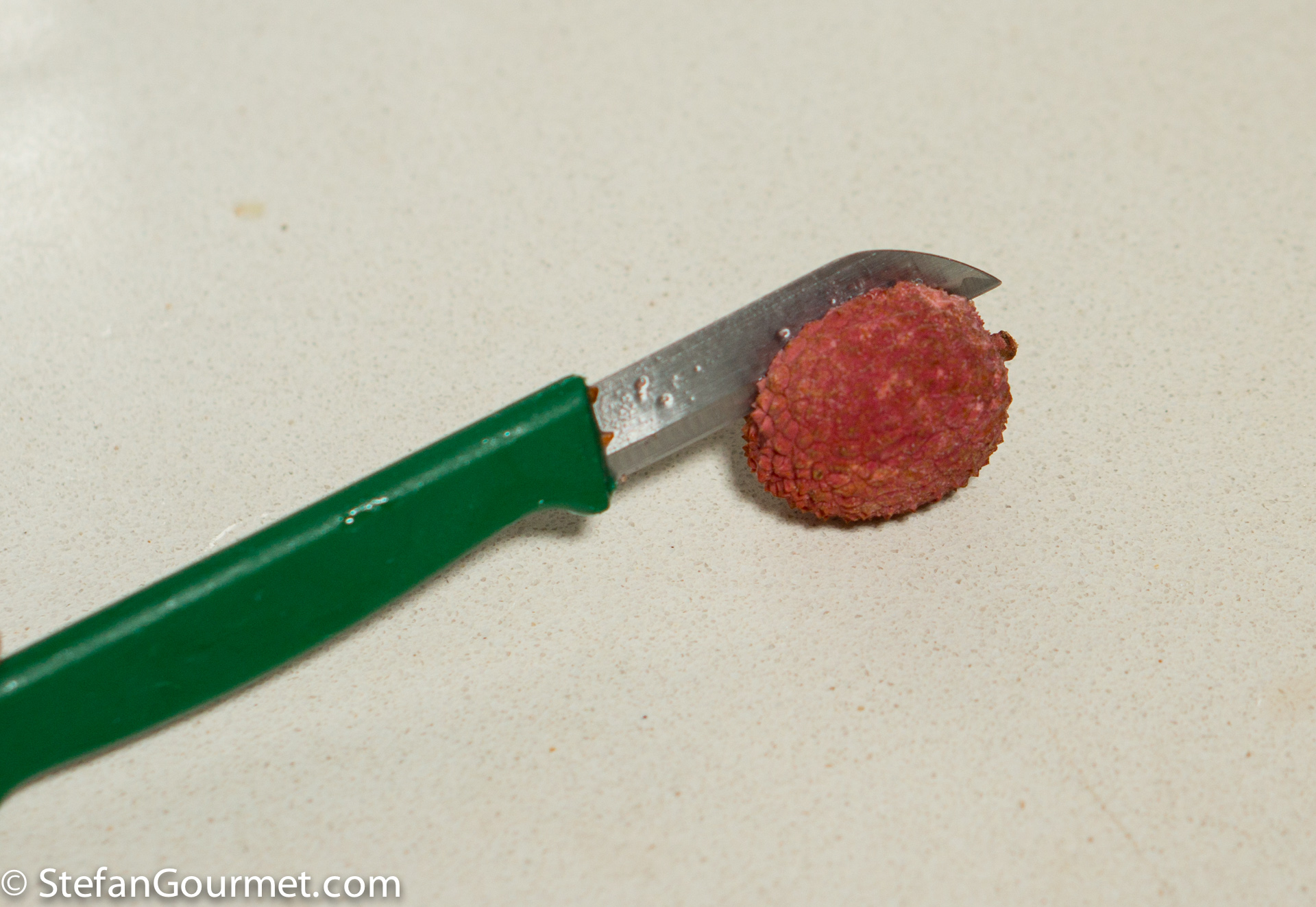 Time to make lychee juice. Cut around each lychee with a paring knife, through the skin until you get to the pit.