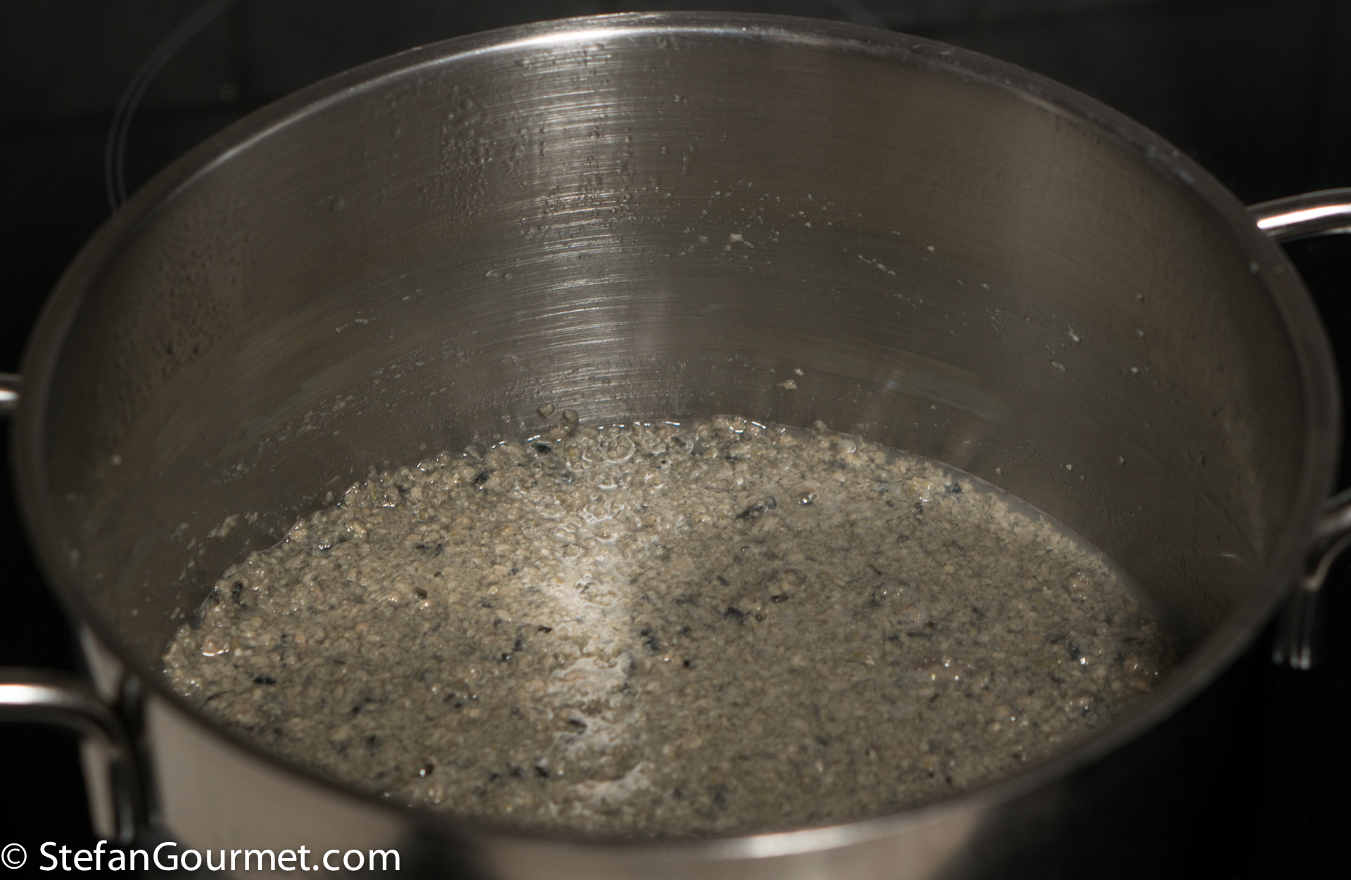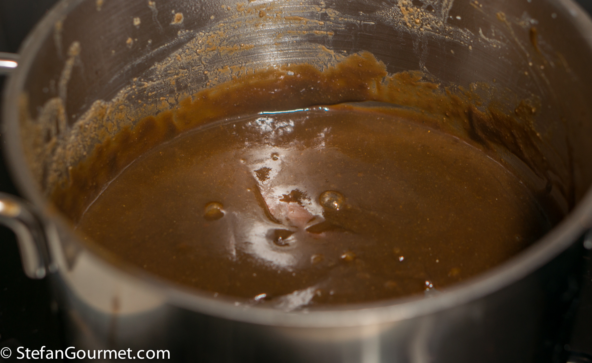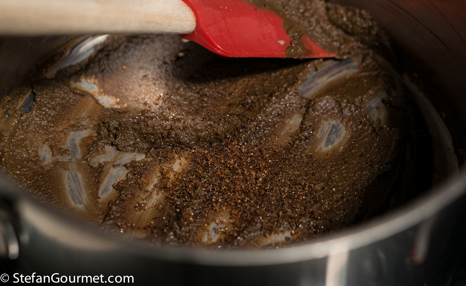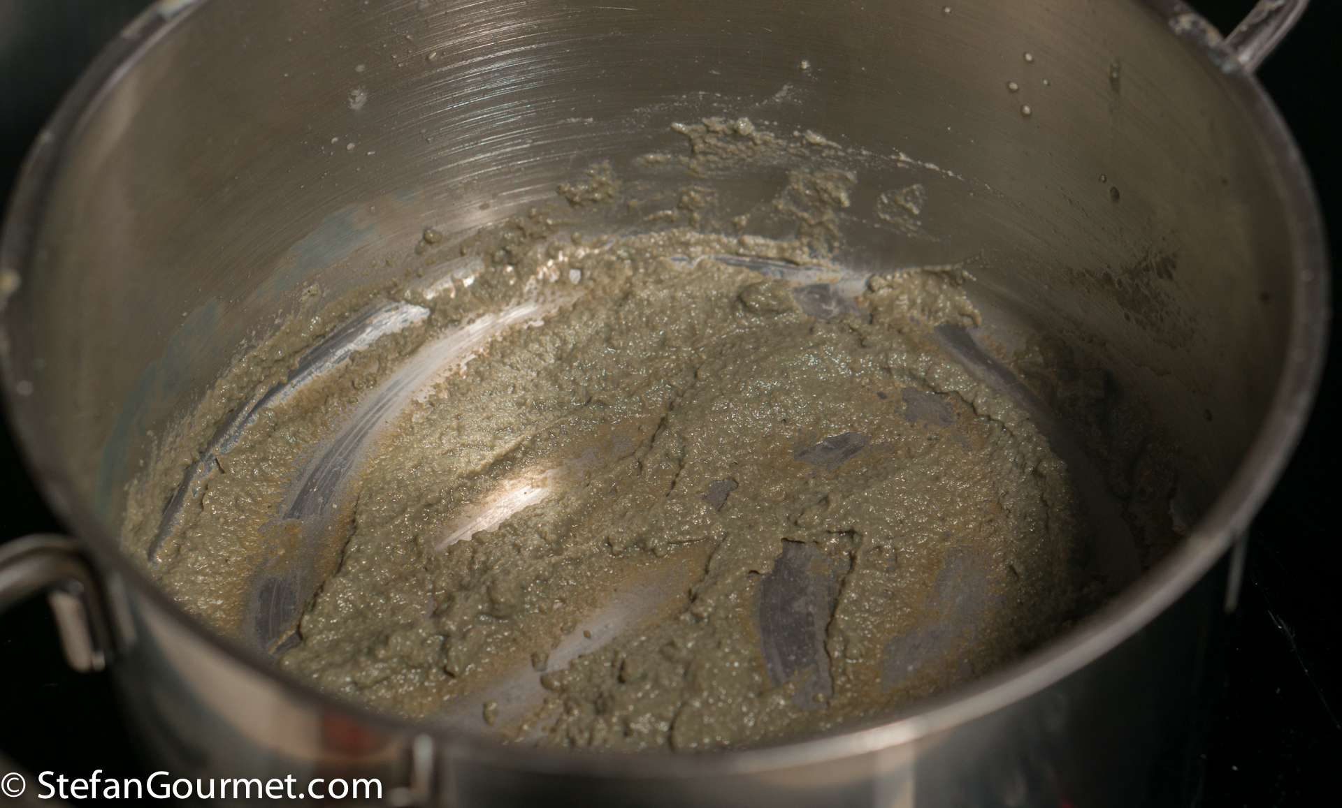 This was further reduced. The resulting ‘stuff’ didn’t look very appetizing and it didn’t become brown but rather a nasty green. It tasted way too salty.