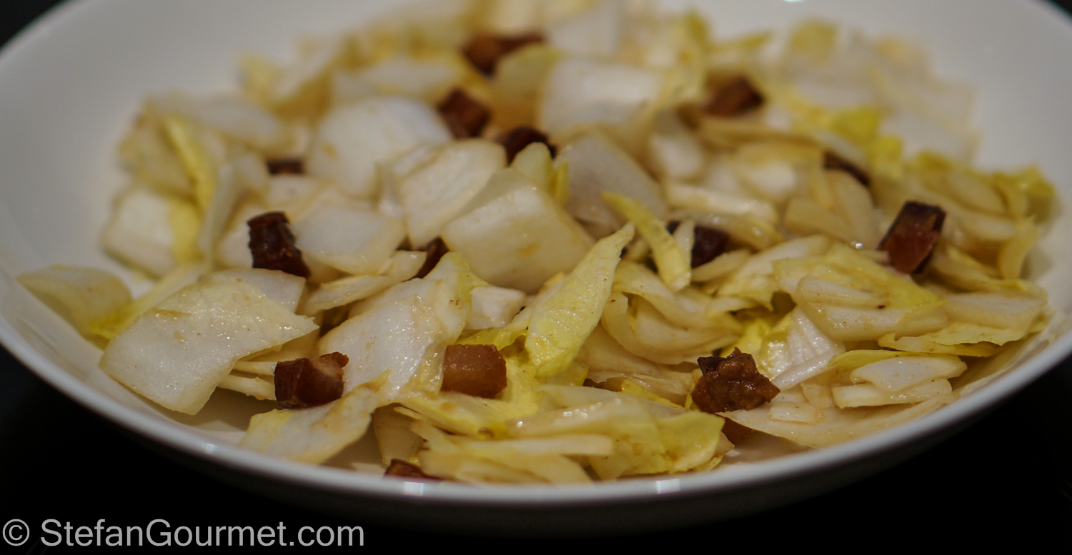 This witlof and pancetta salad is perfect for fall or winter. The city of Treviso (near Venice) is famous for its Radicchio Rosso di Treviso. This is the red cousin of witlof as it is known in the Netherlands and Australia (chicory in the UK, Belgian endive in the US). Since radicchio is hard to come by, I made this salad with witlof instead. The only other ingredients are pancetta, garlic, and wine vinegar (and a bit of salt and extra virgin olive oil if needed). The combination works really well together and is great for an appetizer, lunch, or light dinner.