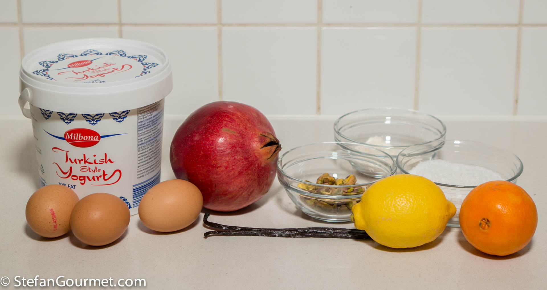 When I saw this yogurt cake on Mimi’s blog, I wanted to make it straight away. She had eaten it at Moro, a restaurant in London, and loved it so much that she made it at home. I can see why, because it is both original and delicious. The nice thing about this yogurt cake is that it is very light and fresh, and with the pistachios and pomegranate seeds it looks very festive as well. There is hardly any flour in it, so it is a lot like a soufflé. Unlike many other desserts, it is not heavy at all, so even after a big meal you can still enjoy this. I liked it so much that I’ve already made it twice.