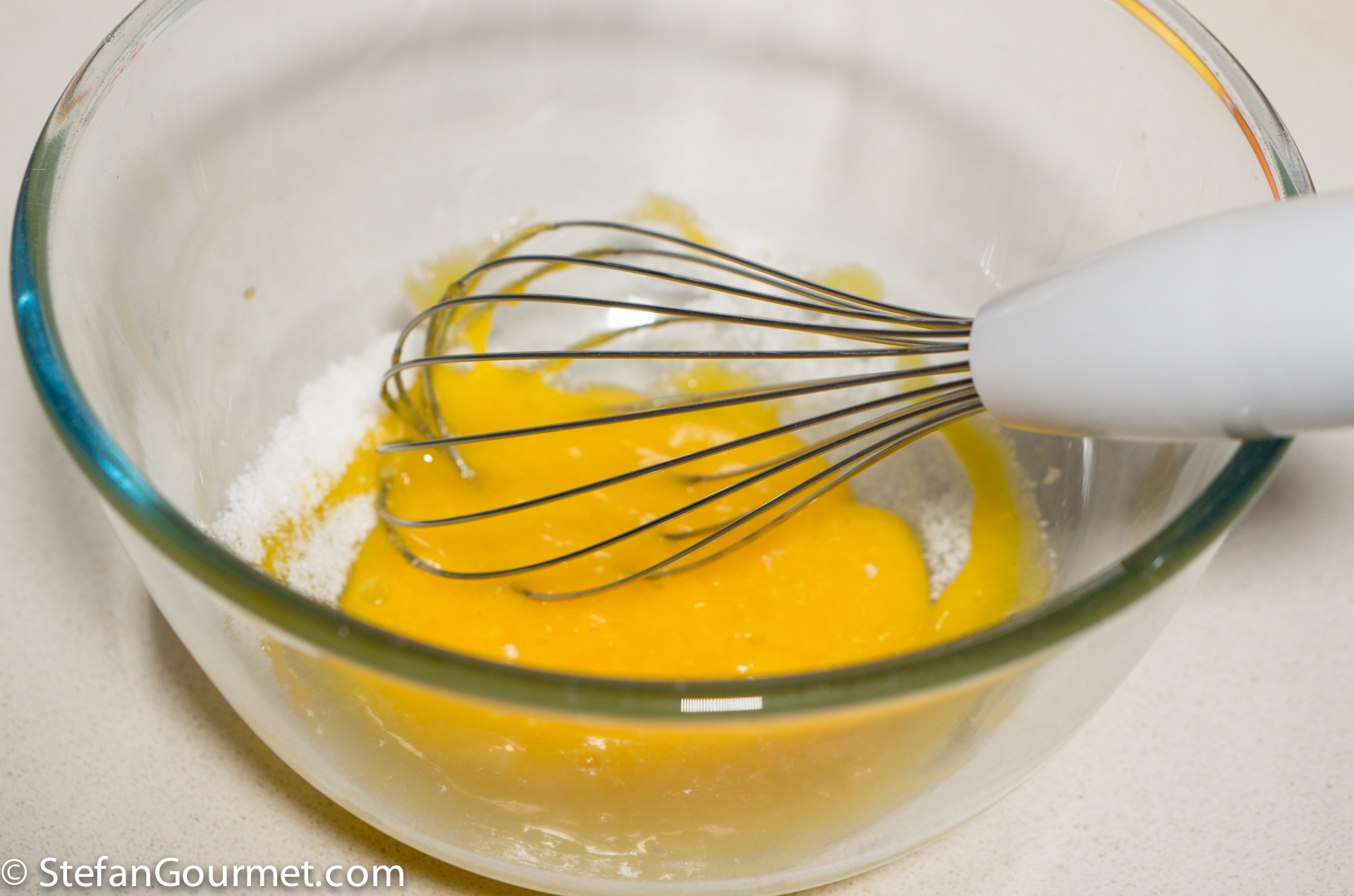 Combine 3 egg yolks with 50 grams (1/4 cup) of caster sugar in a bowl, and whisk until pale and creamy.