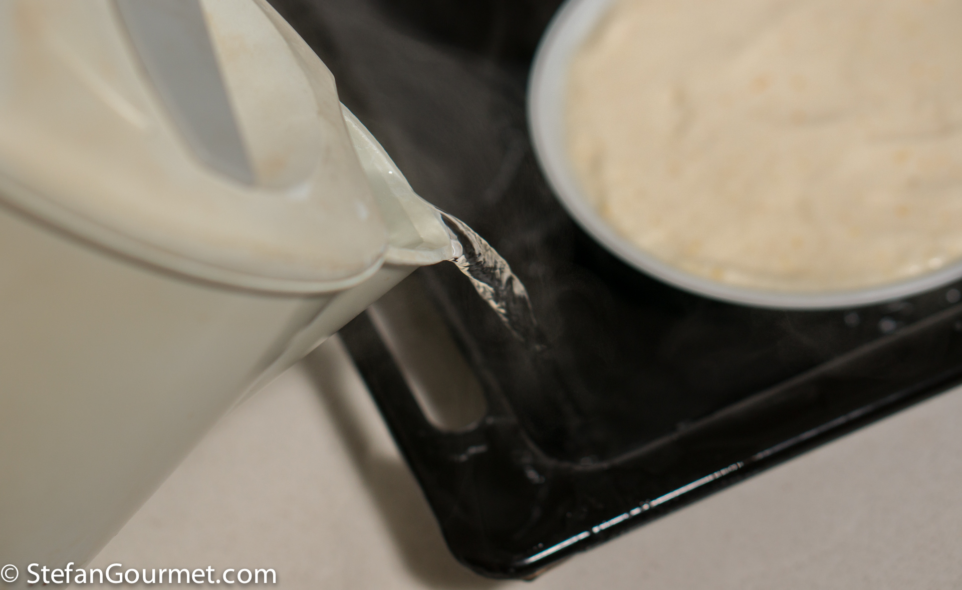 Pour boiling water around the ramekins until the water reaches halfway up the ramekins.
