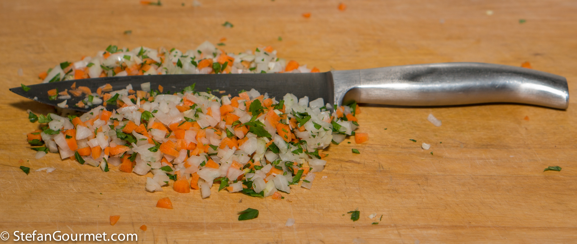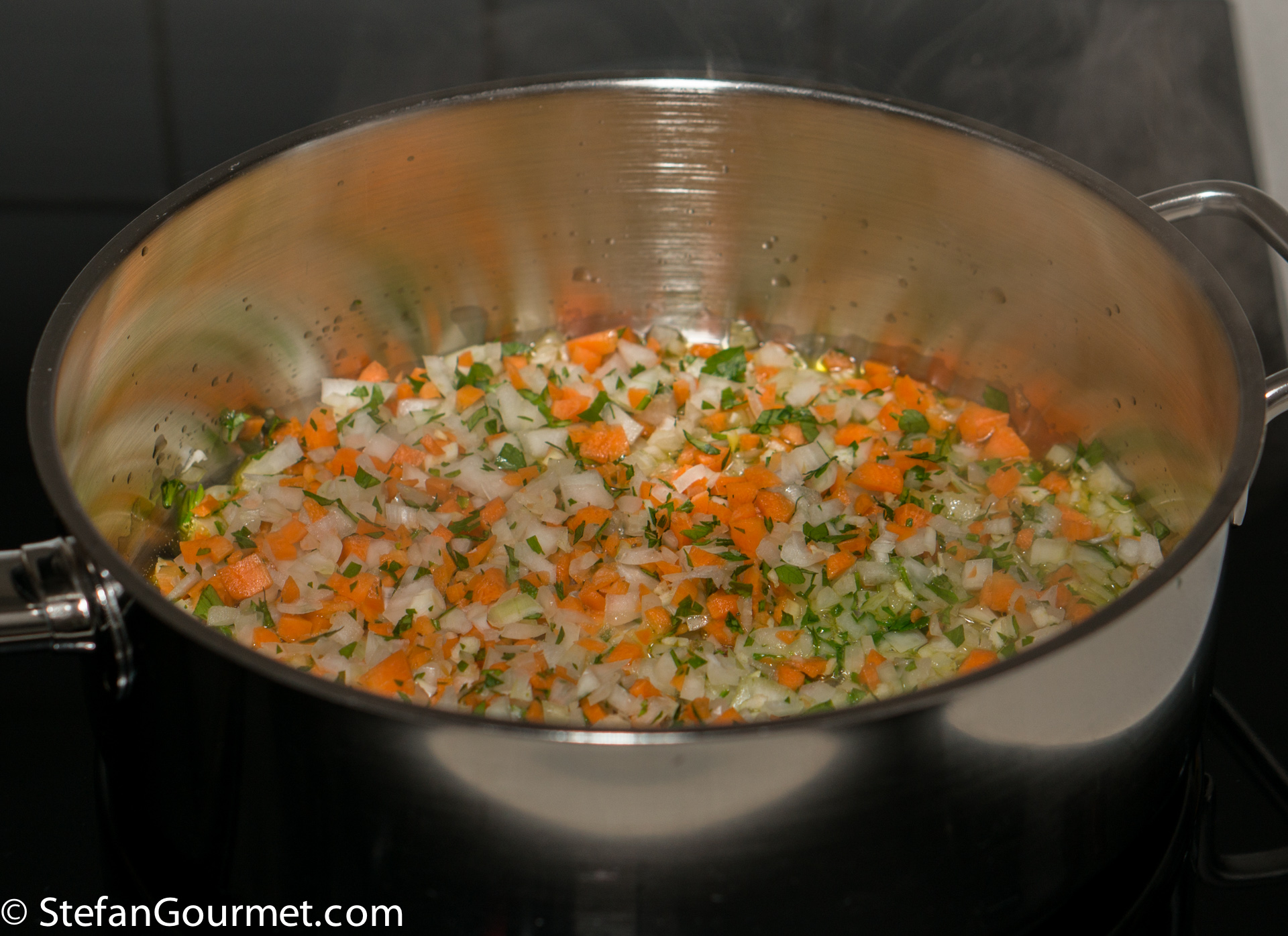 Heat 2 tablespoons of olive oil in a frying pan. Add the minced vegetables, and stir for a minute over medium heat.