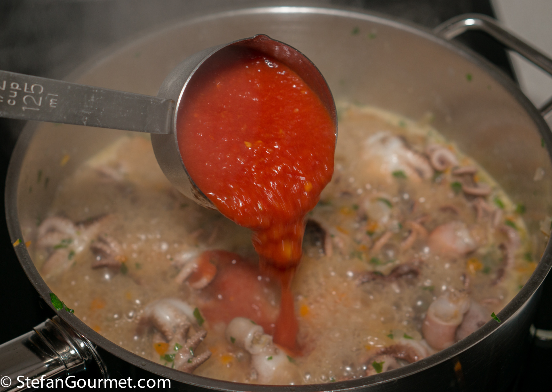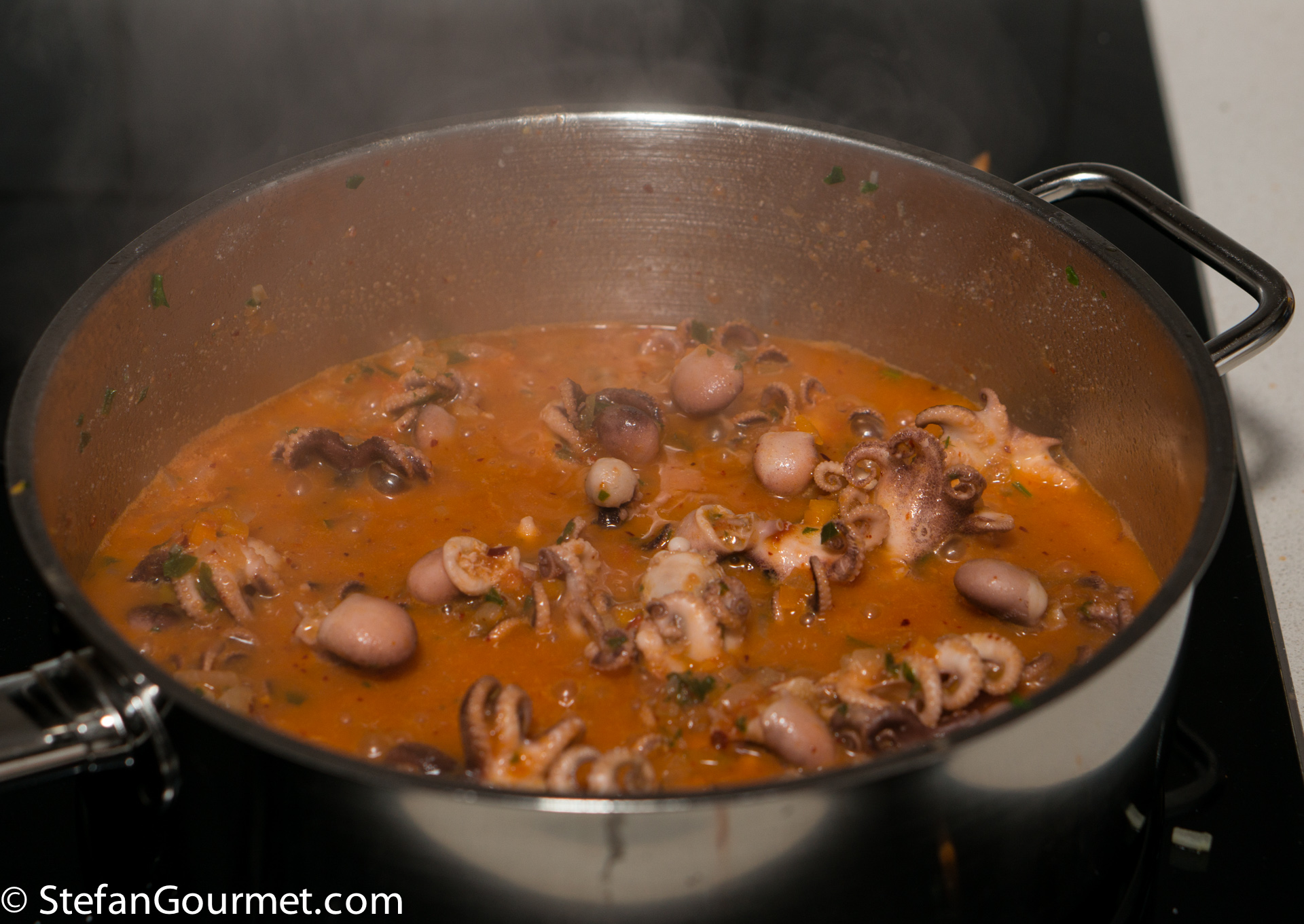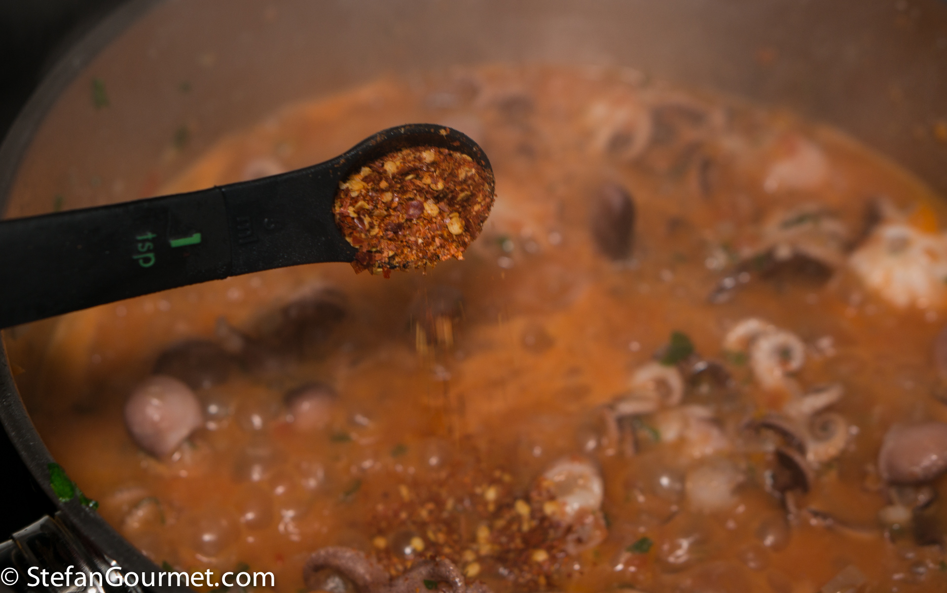 …until the octopus is tender and the sauce has been reduced, about an hour. Taste and adjust the seasoning with salt and chilli flakes.
