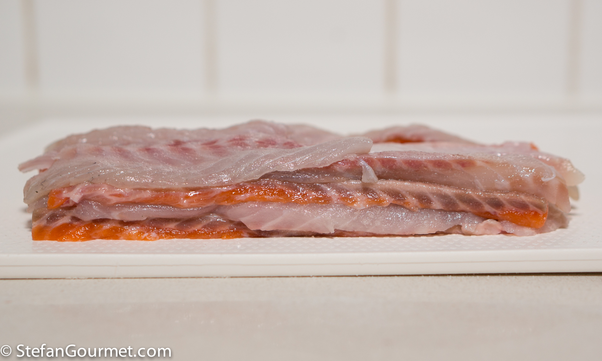 The result looked intriguing, and it tasted just fine. The texture was quite firm, which I think was caused because the alternating layers of fish created some additional structure to the flesh.