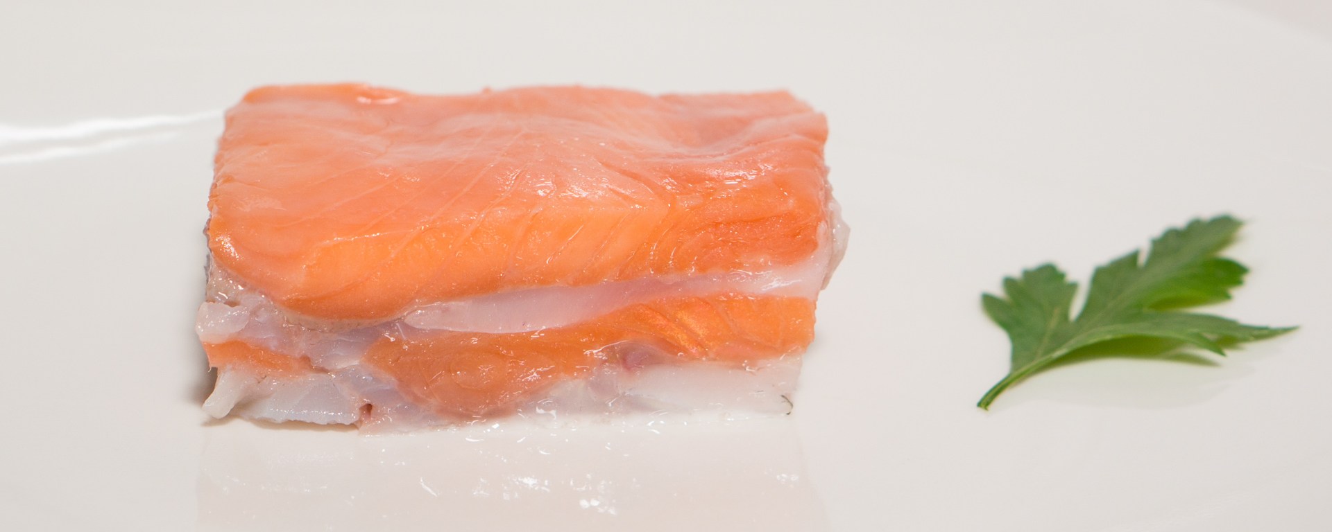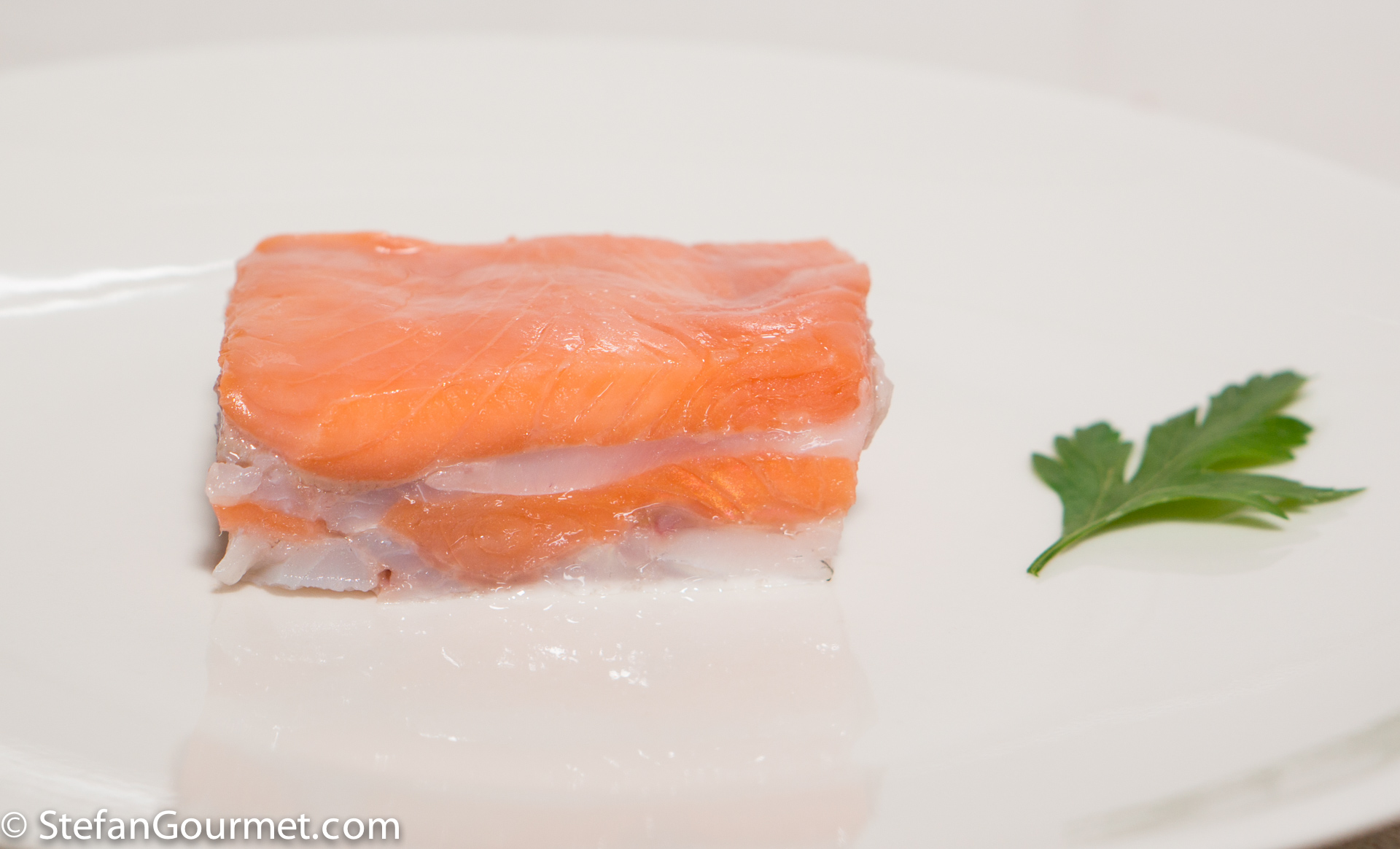 What you see in the photo above is the result of a bit of playfulness. Or silliness. It is salmon and sea bass, glued together, and then cooked sous-vide as if it is some kind of mutant fish with layers of orange-pink and white flesh. This is possible by using a (perfectly natural and harmless) enzyme called transglutaminase, also known as Activa (the brand name) or simply “meat glue”. It can glue together all kinds of protein. I’ve used it for both meat and fish before, but not yet to glue two different kinds of meat or fish. I thought it would be fun to try this with fish, but first I had to think of two different kinds of fish that can be cooked at approximately the same temperature. And so I came up with salmon and sea bass, and a temperature of 48C/118F.