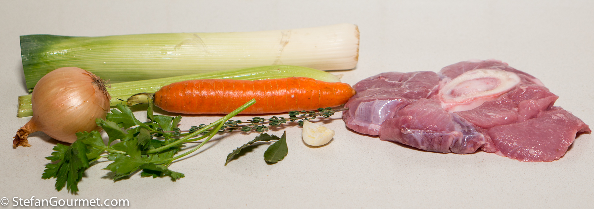 Start with the stock. Cut the veal shank off the bone into pieces, and reserve the bone.