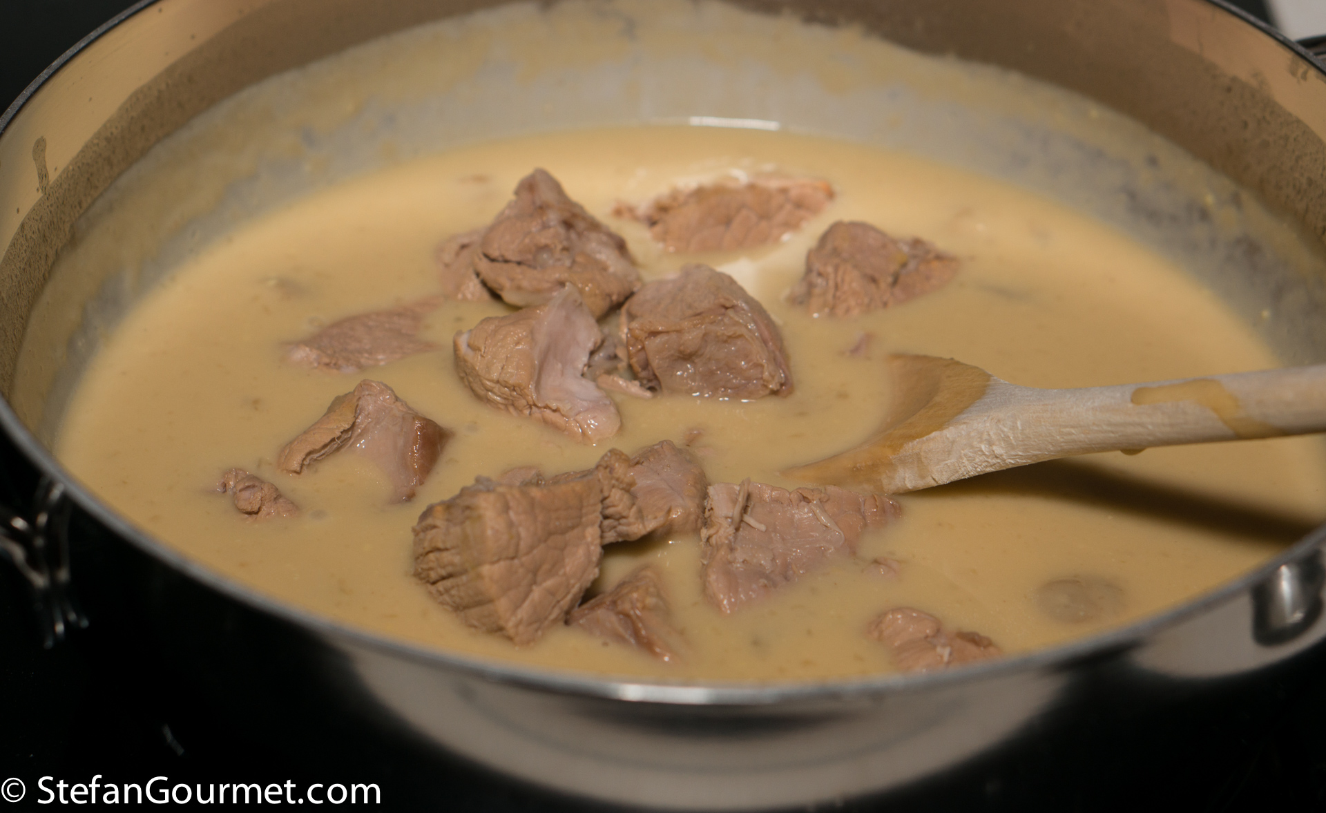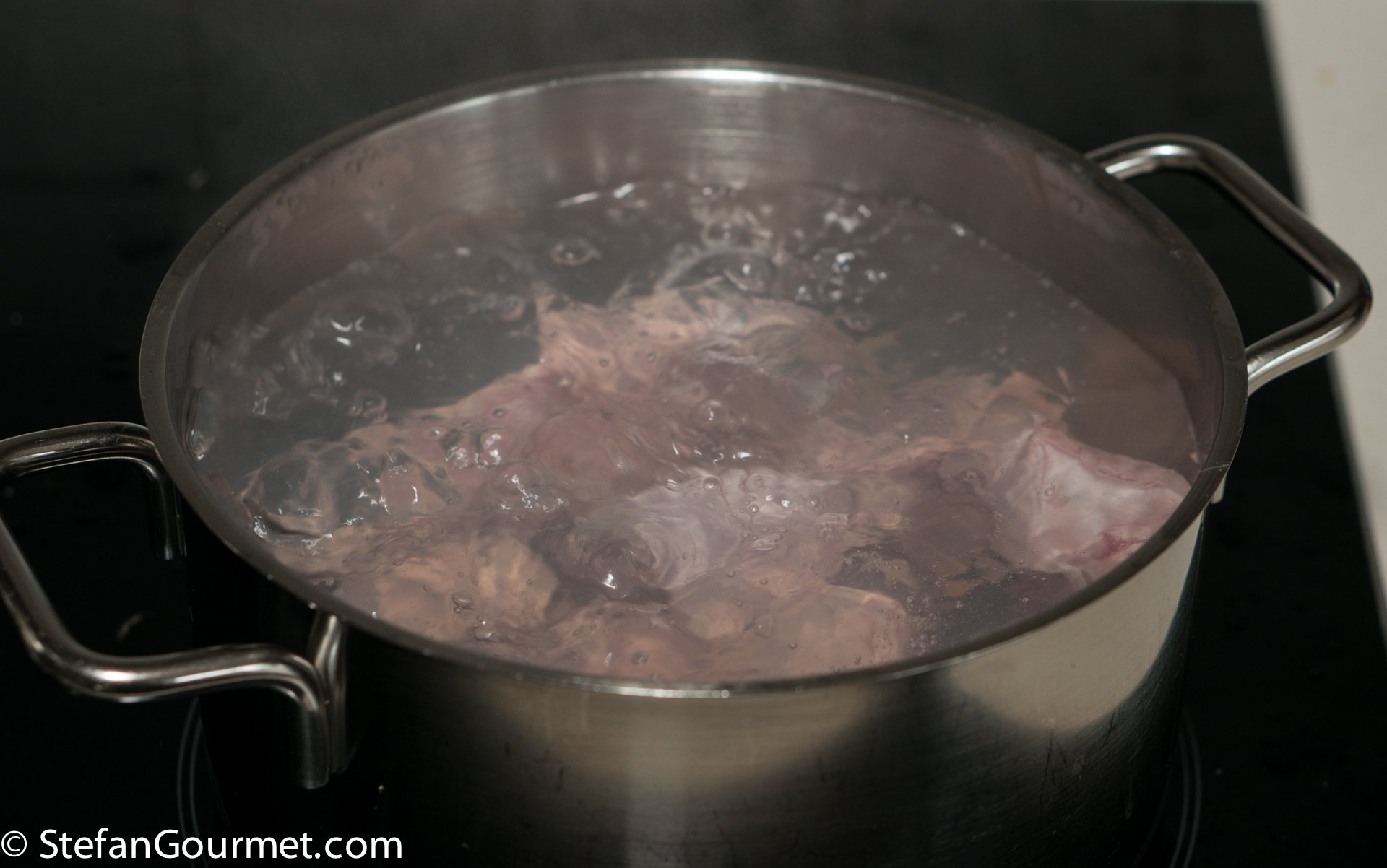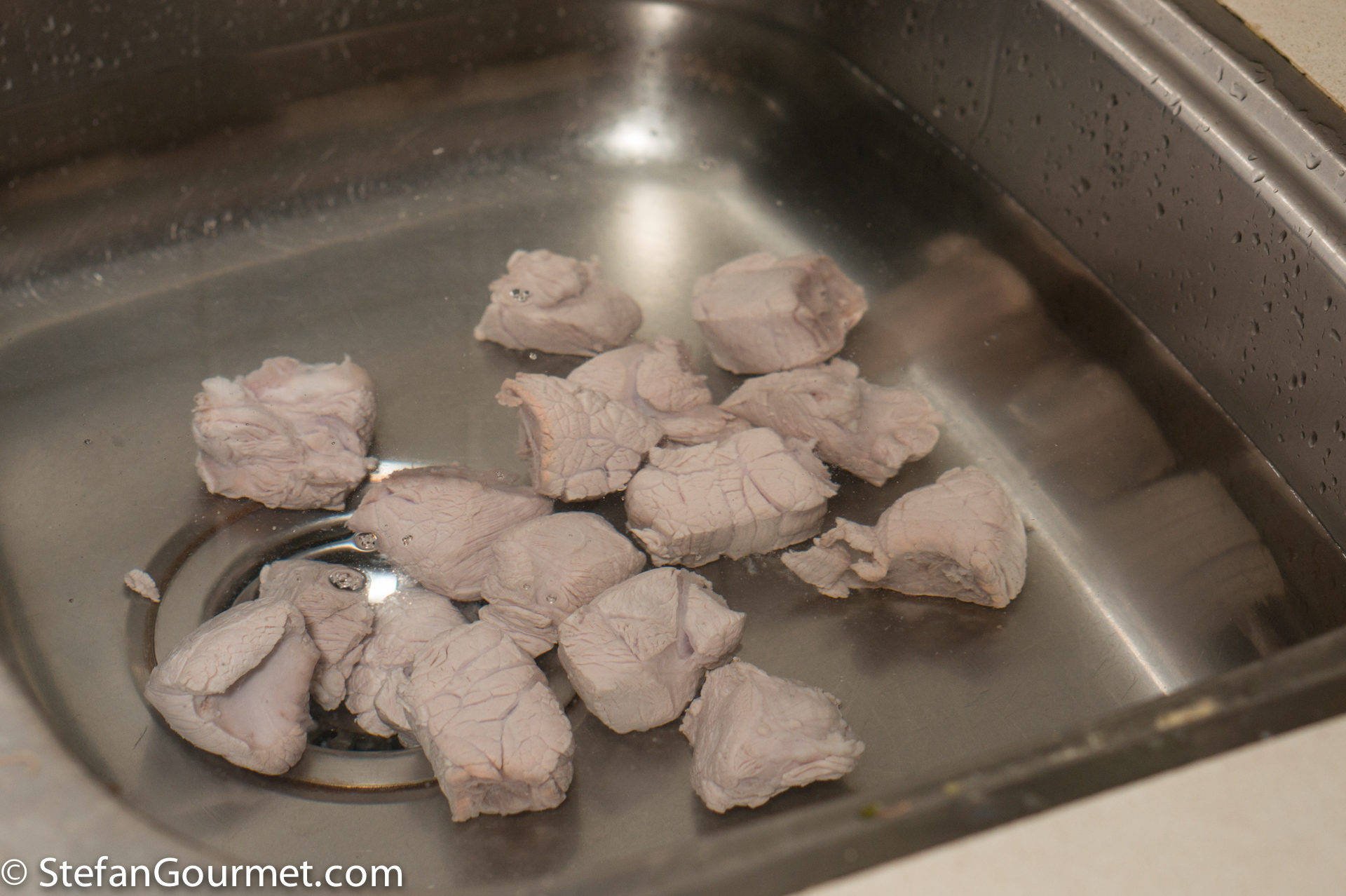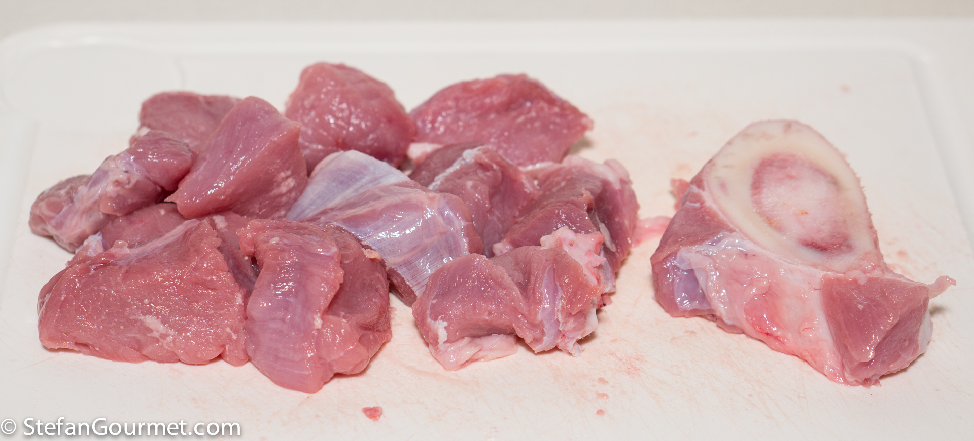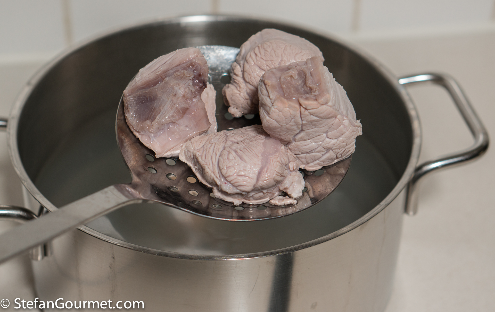 Now that the stock is ready, we can start with the actual dish. Bring a pot of water to a boil. In the meantime, cut the veal shoulder into cubes of about 4 cm (1.5″). When the water boils, add the veal cubes…