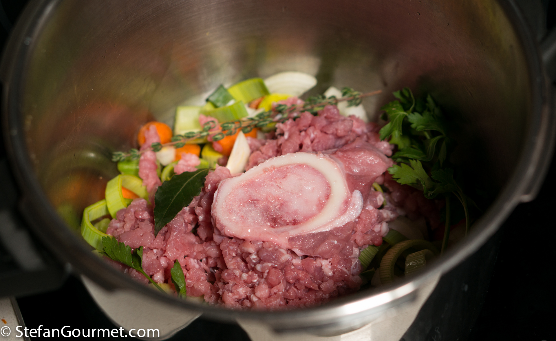 Put the (ground) veal and the bone in a pressure cooker or stock pot together with the aromatics.