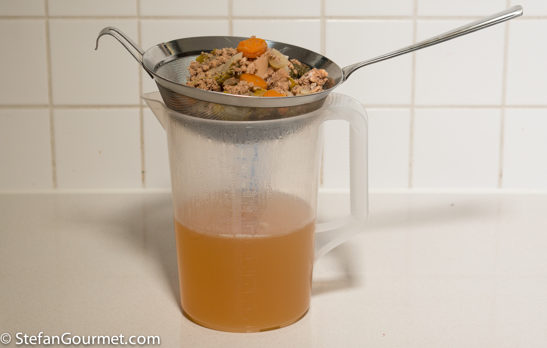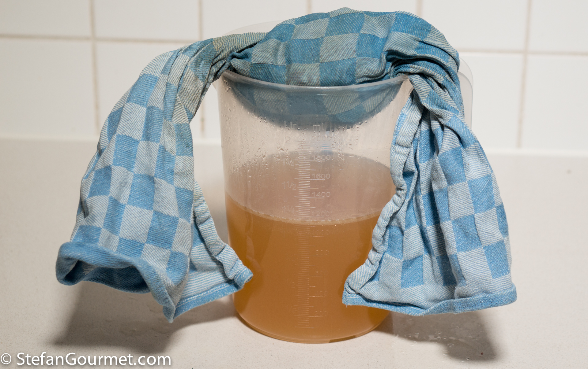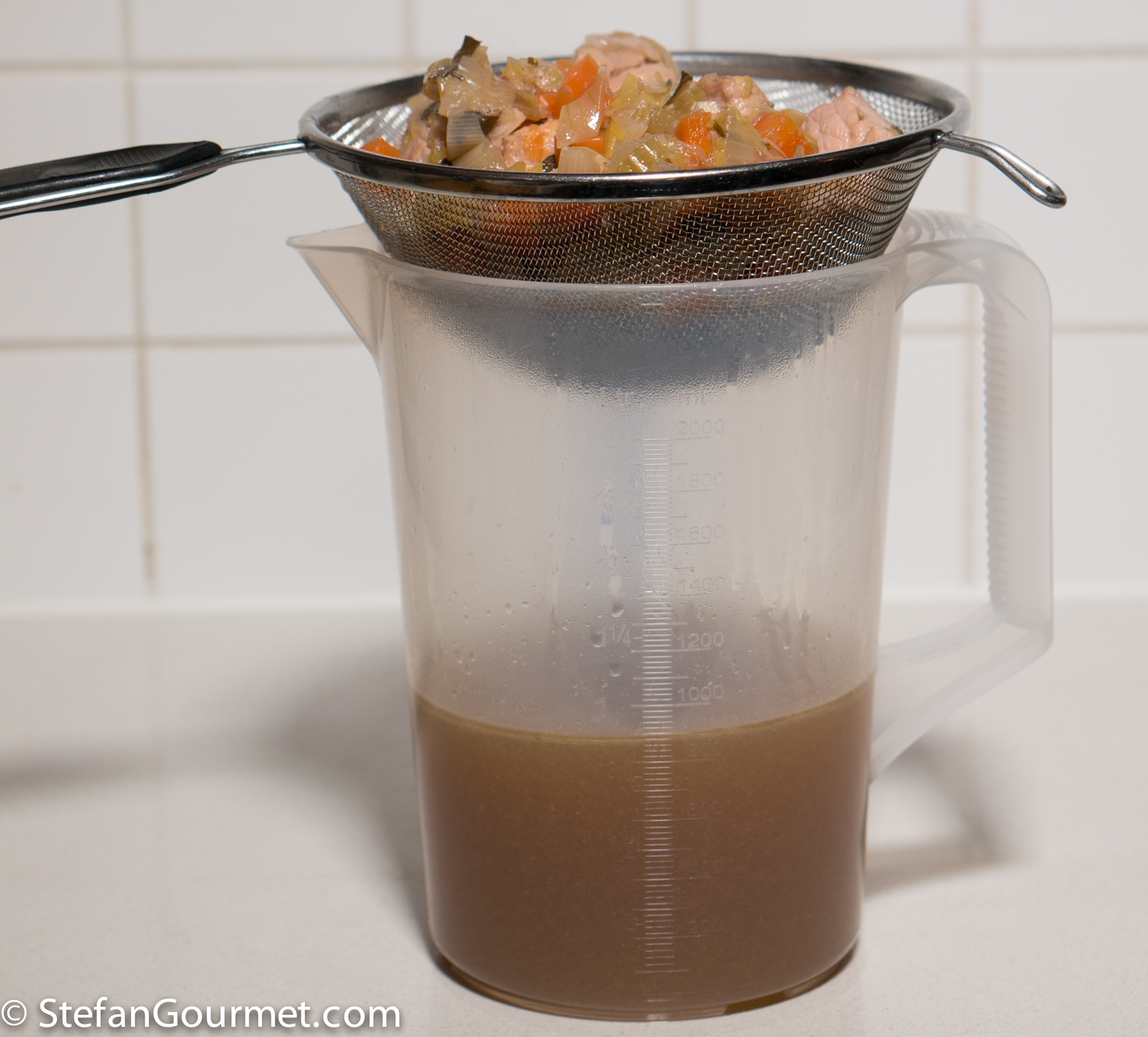 Many stock recipes are very precise about what you need to do (and not do) to obtain a clear stock, or prevent a cloudy one. As this stock will be used to make a white sauce, you don’t have to follow all those rules and you can get a better yield by squeezing out the meat and vegetables using an old but clean kitchen towel. (This is ‘forbidden’ in classic stock recipes as it causes a cloudy stock.)