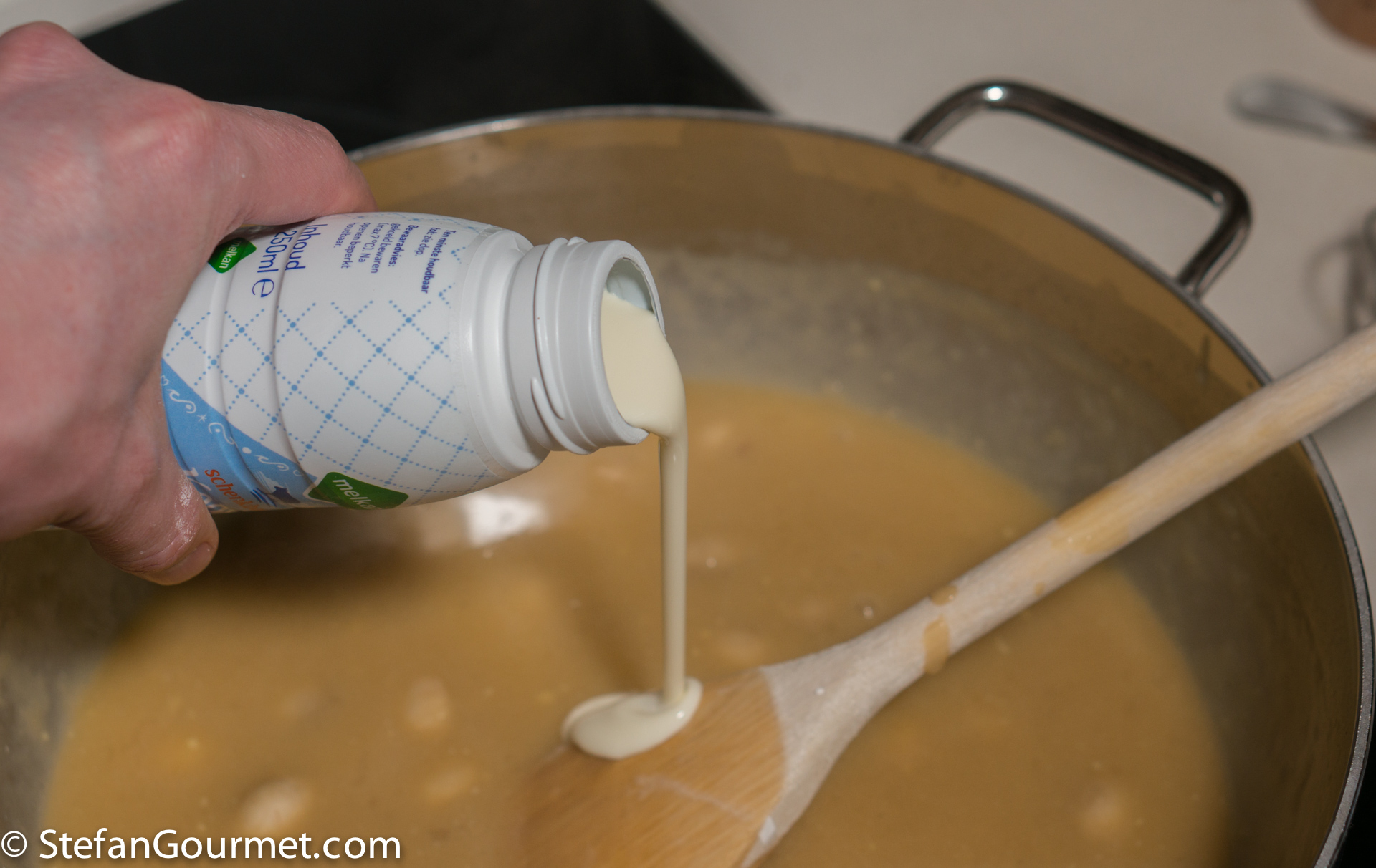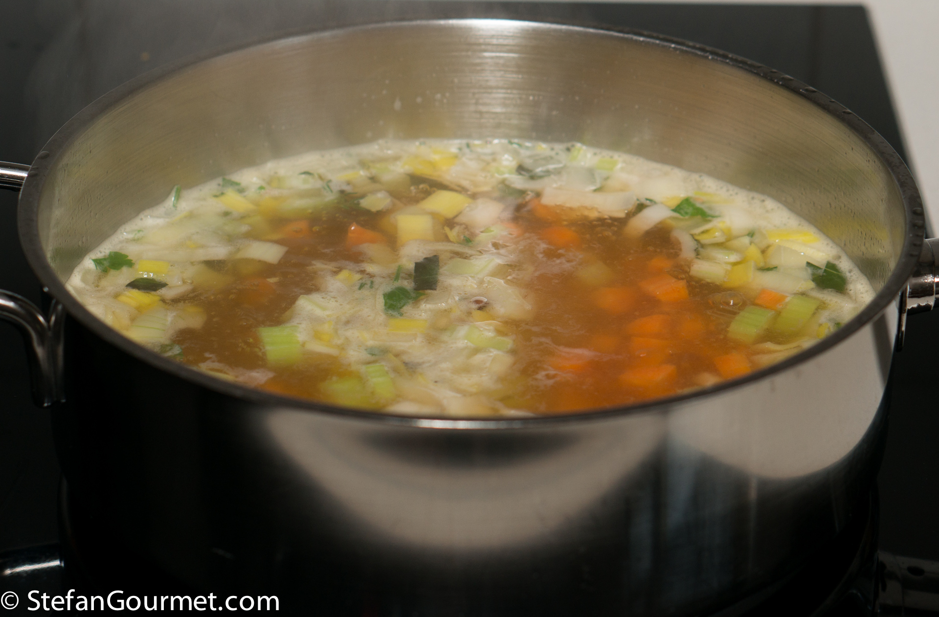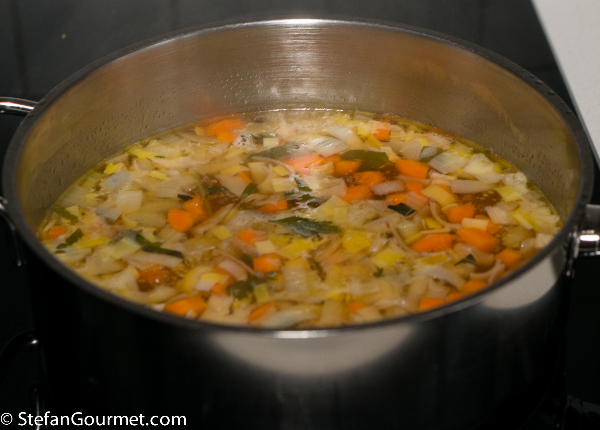Many stock recipes are very precise about what you need to do (and not do) to obtain a clear stock, or prevent a cloudy one. As this stock will be used to make a white sauce, you don’t have to follow all those rules and you can get a better yield by squeezing out the meat and vegetables using an old but clean kitchen towel. (This is ‘forbidden’ in classic stock recipes as it causes a cloudy stock.)