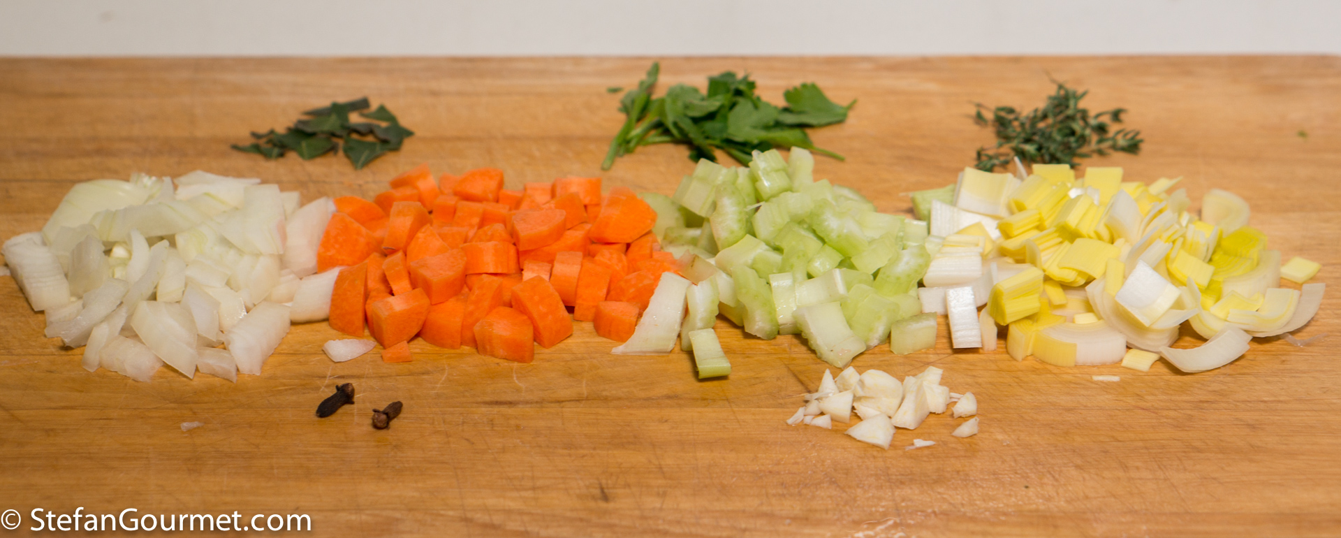 1/2 onion, 1/2 carrot, 1/2 stick celery, 1/2 leek (white part only)