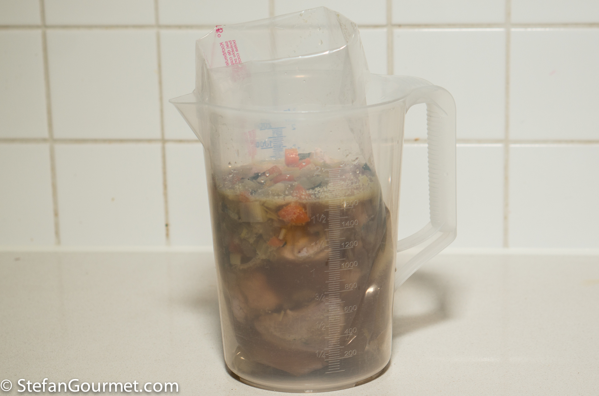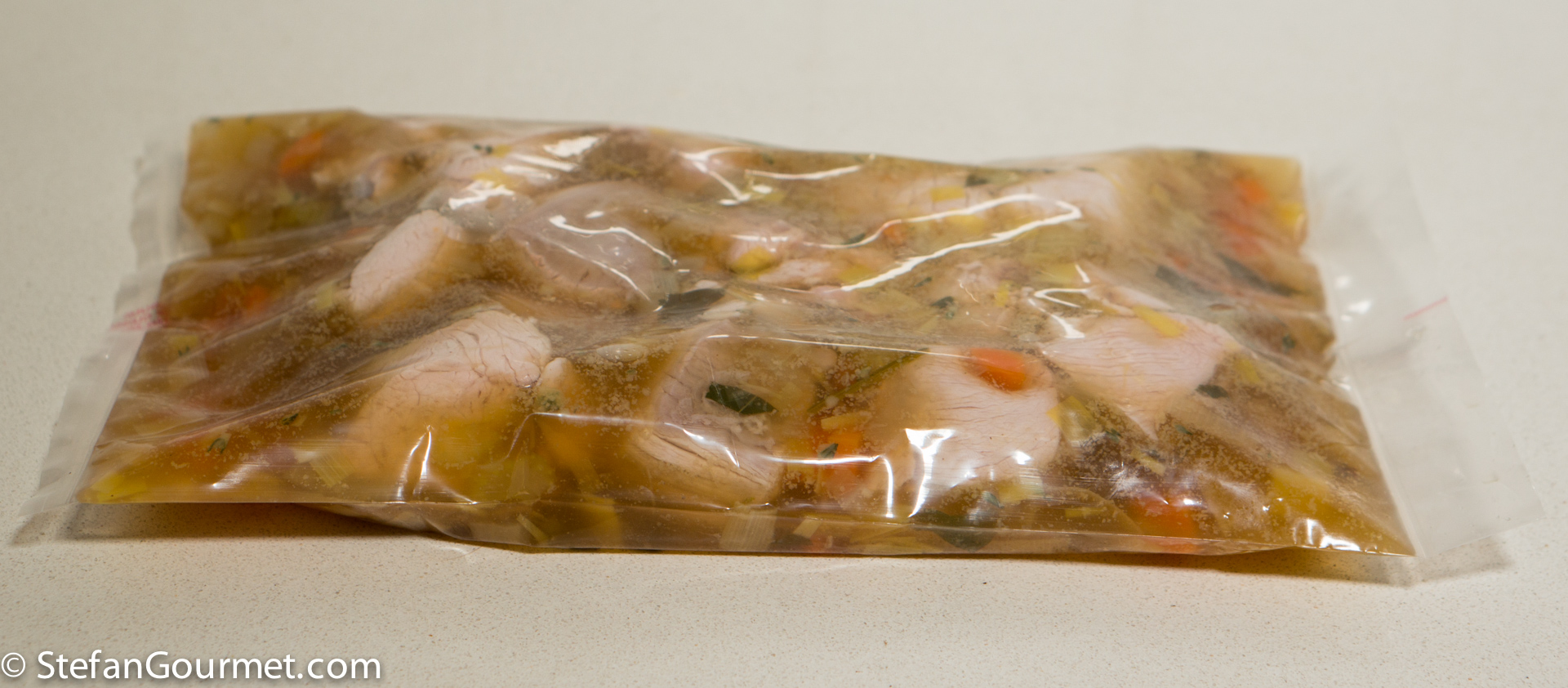 If using a chamber vacuum sealer, allow the stock with aromatics to cool to room temperature before vacuum sealing together with the veal cubes. It is easier to transfer everything into a sous-vide bag if using a cylinder (in this case a large measuring jug) and if the sleeve of the bag has been rolled up so it stays clean to get a good seal.