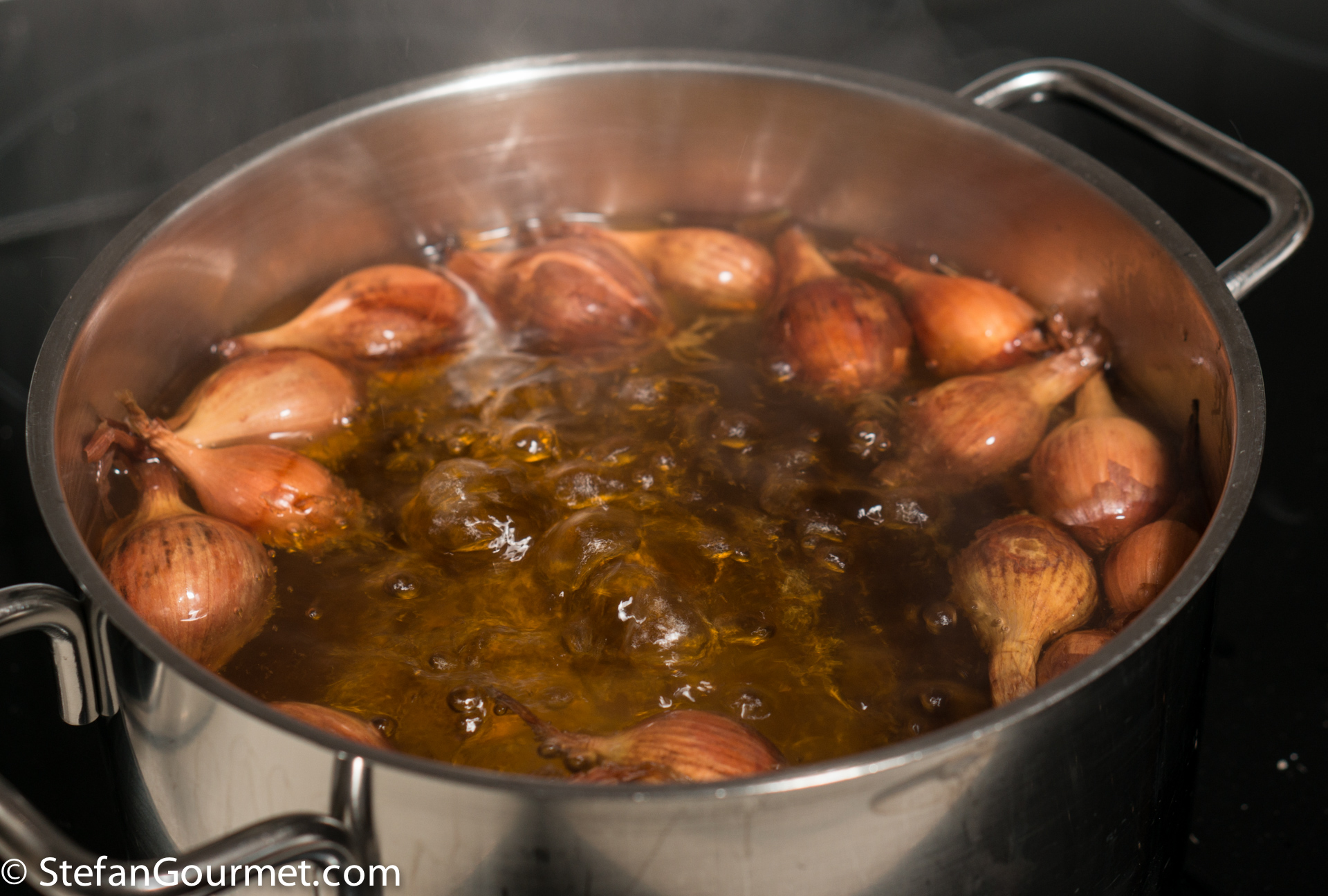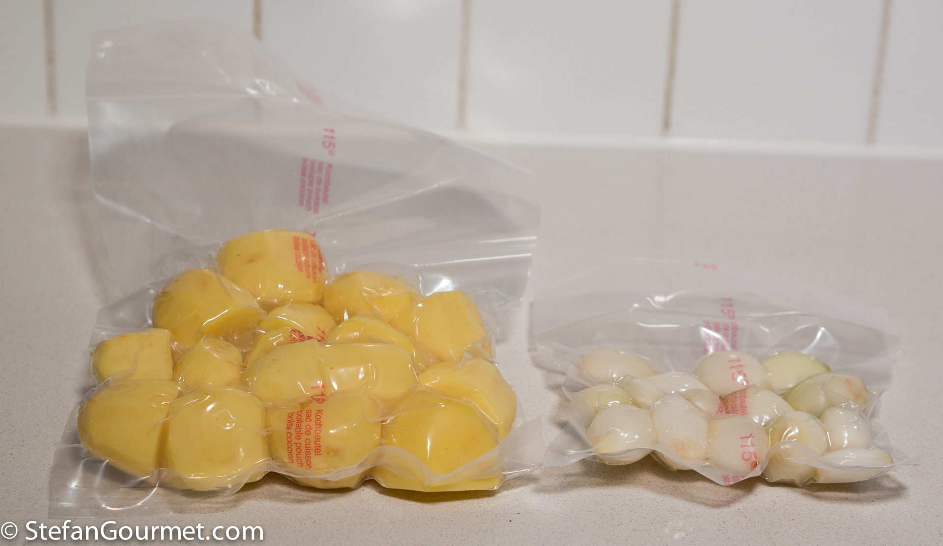 Peel the potatoes and cut into pieces (it looks nicest to use small potatoes whole or cut into halves). Vacuum seal potatoes and pearl onions, and cook sous-vide for 90 minutes at 84C/183F.