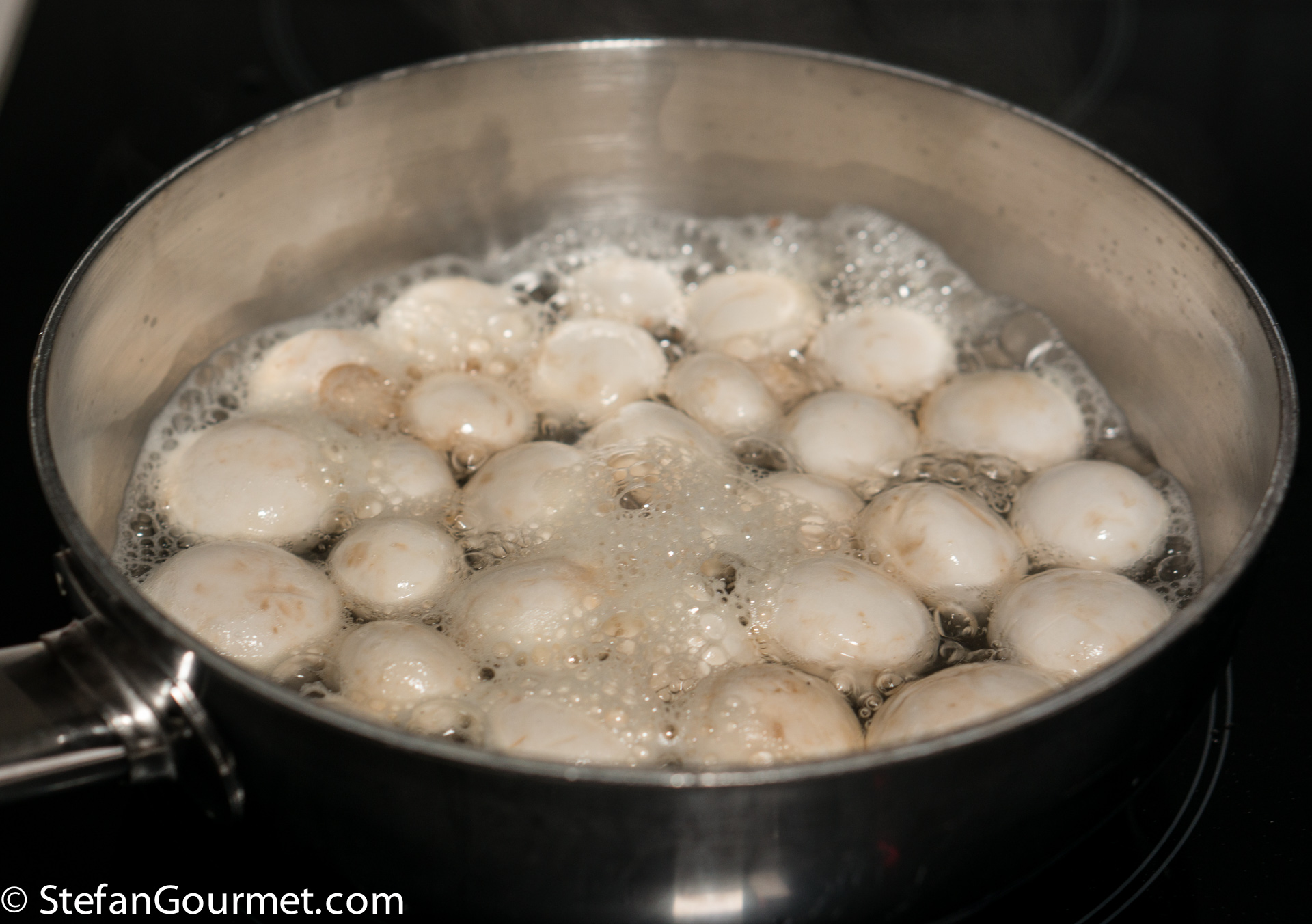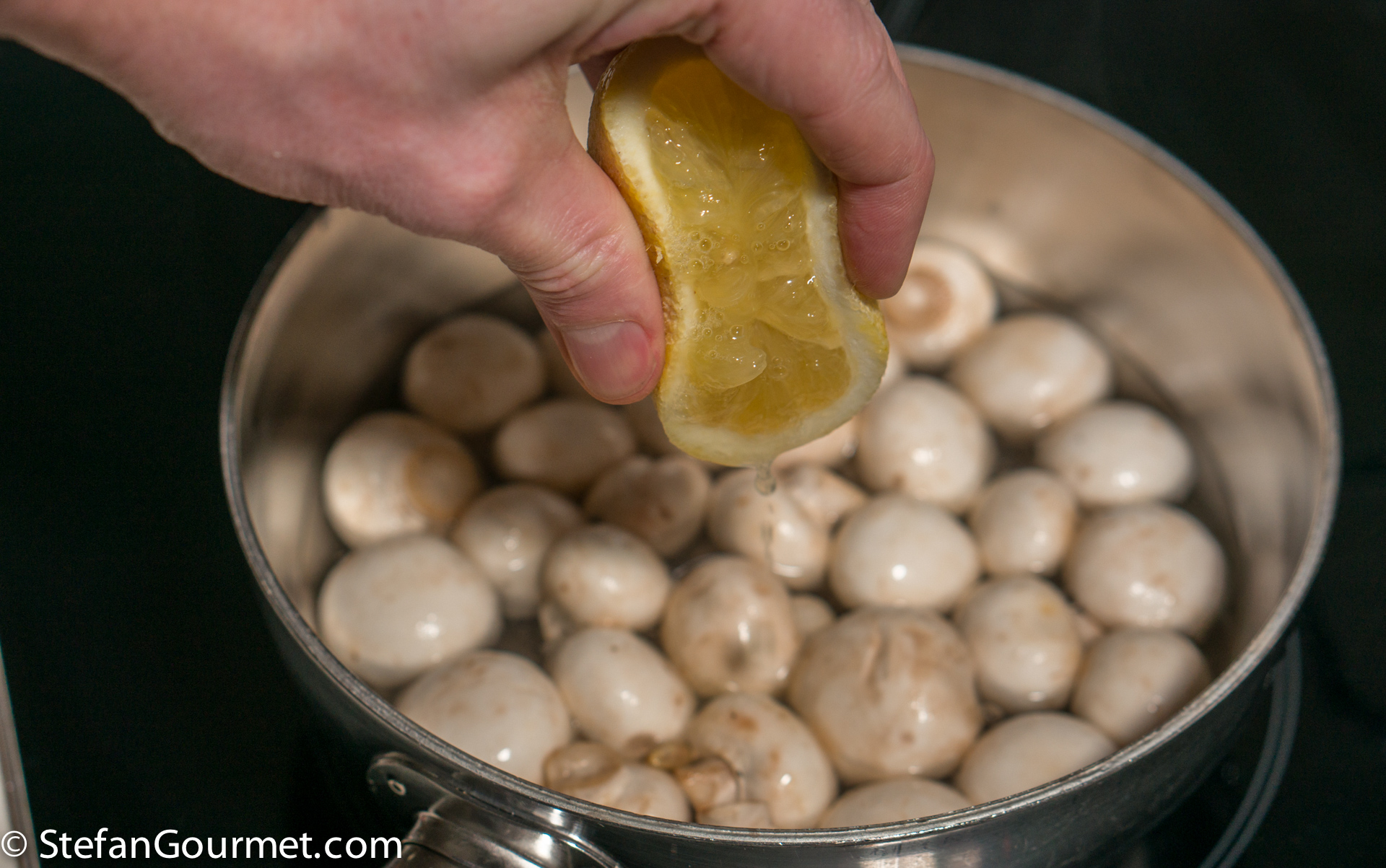 Clean the baby mushrooms (or use regular button mushrooms and cut them into quarters) and put them in a saucepan. Barely cover with water and add some lemon juice to lower the pH of the cooking water. This will help the mushrooms to keep some bite (do not add salt).
