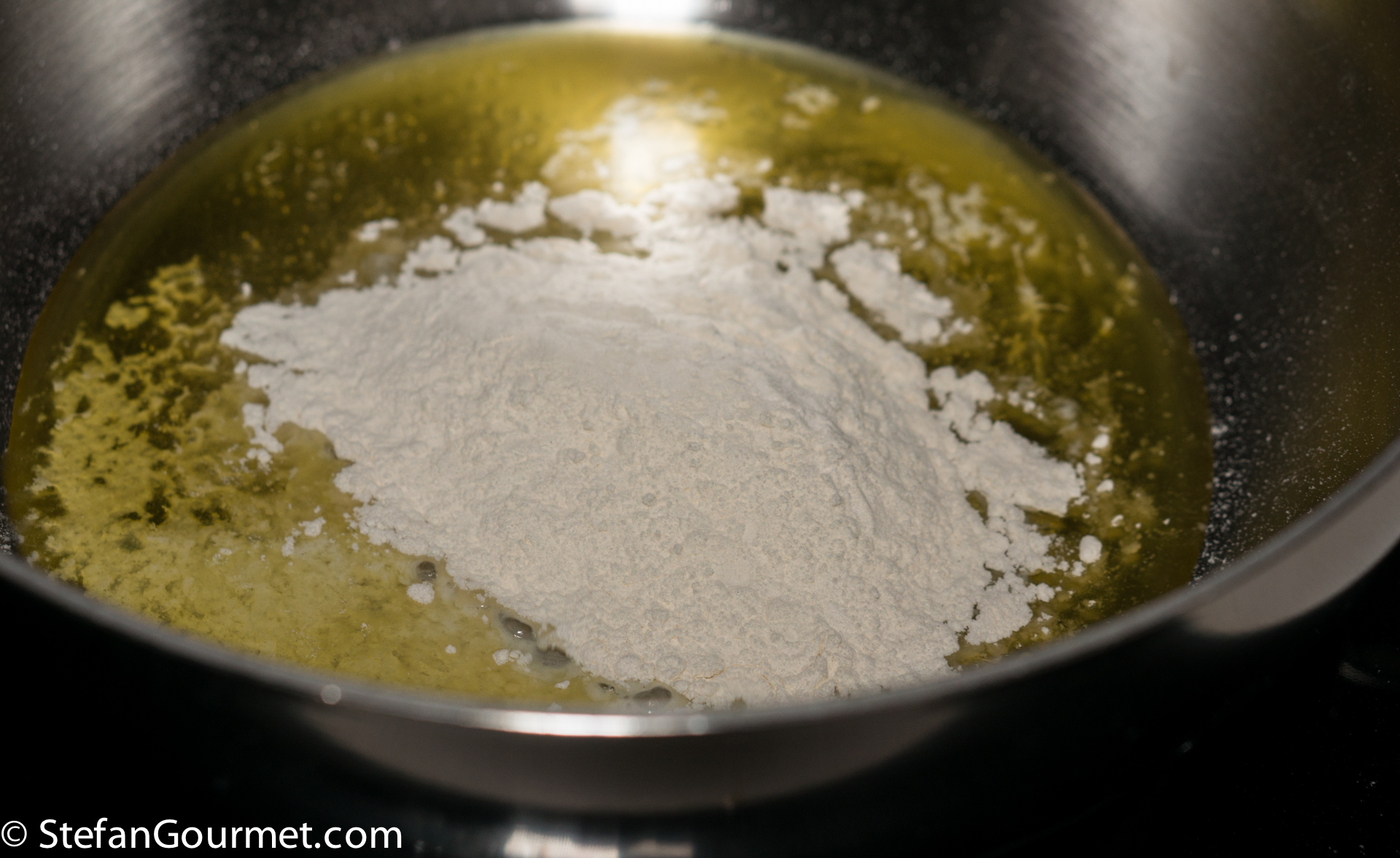 Stir over low heat until the roux is cooked, about minute, making sure not to allow the roux to brown.
