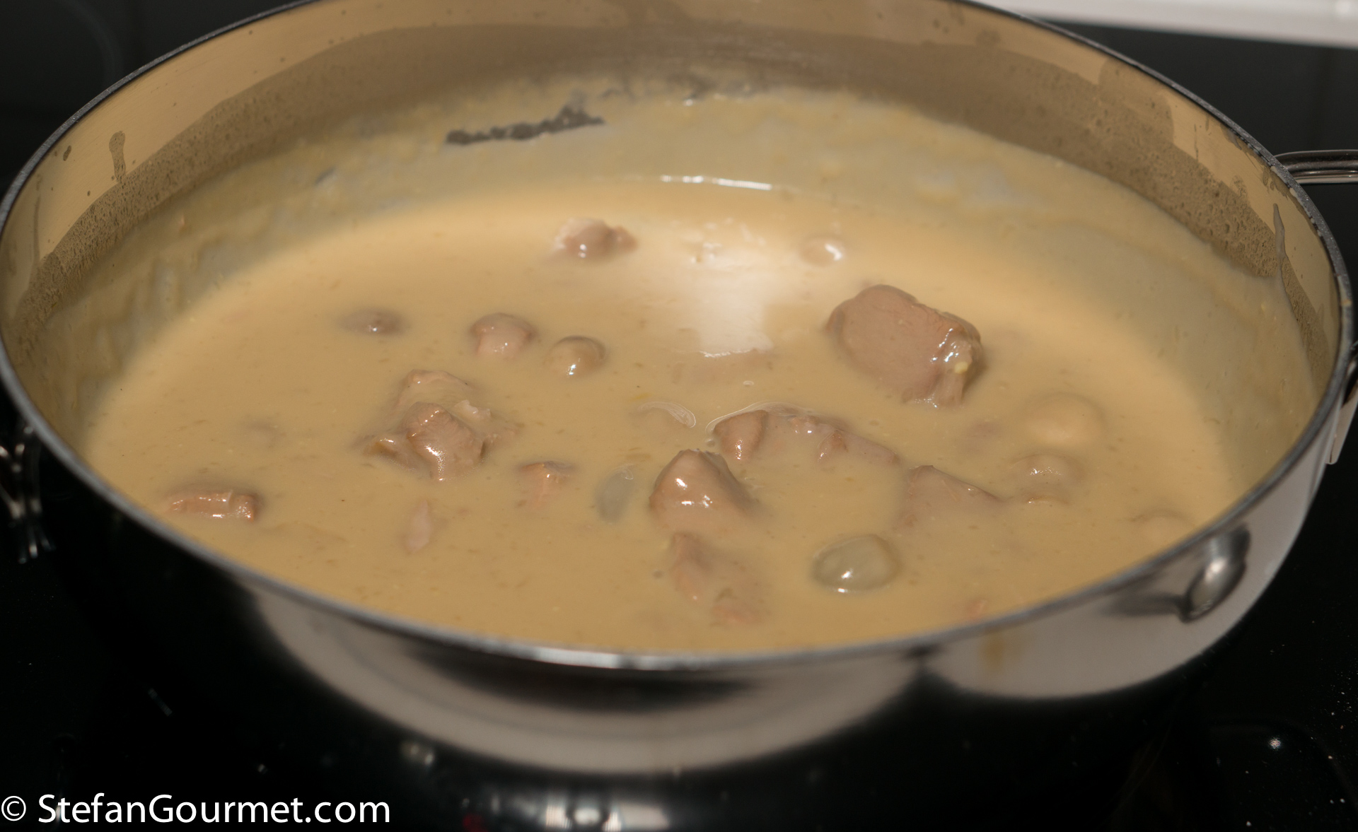 Stir over low heat to heat everything through, until steaming hot but again without reaching a boil. Taste and adjust the seasoning with salt and freshly ground white pepper.