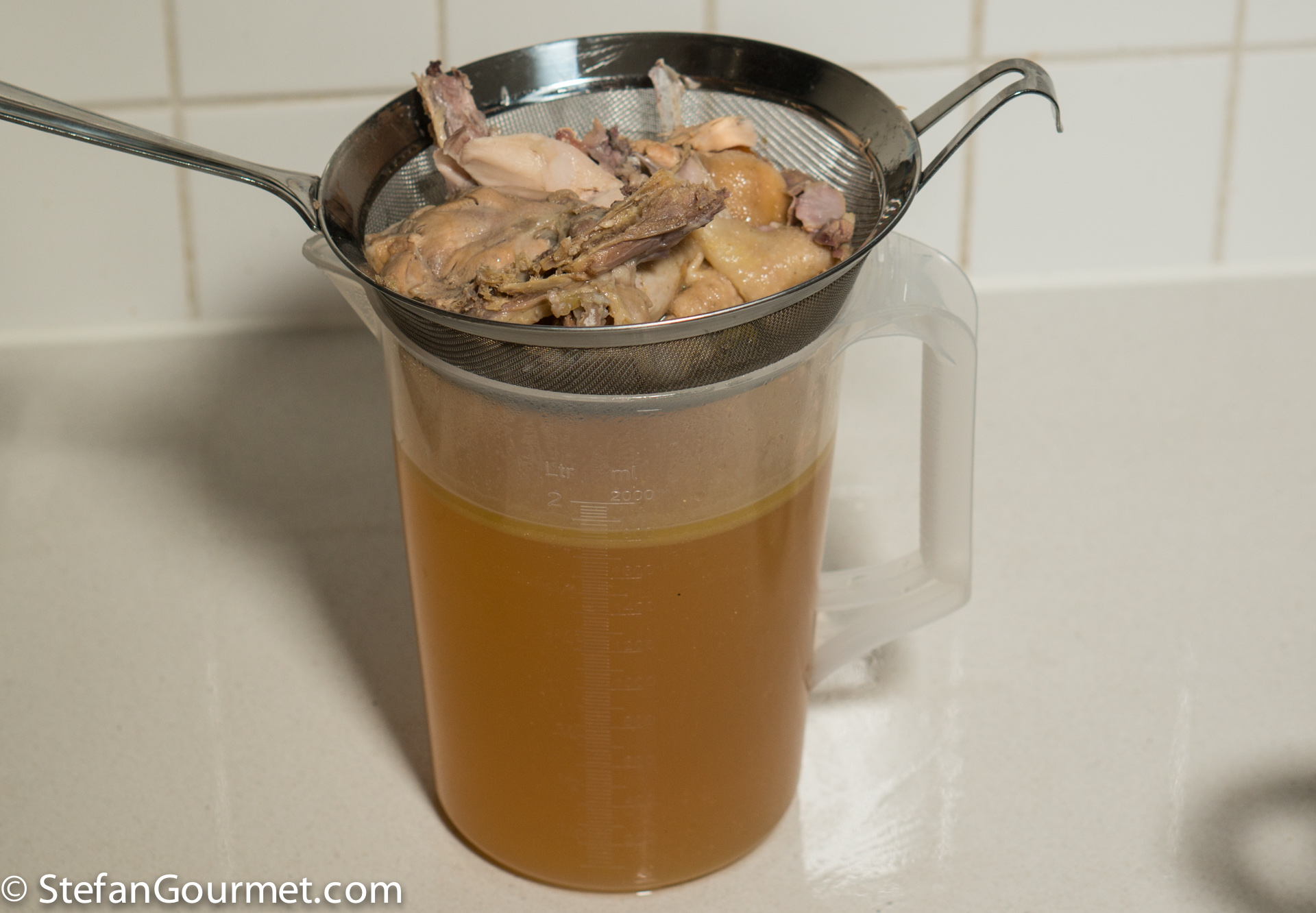 Strain the chicken broth through a fine sieve. If you like, you can spoon off some of the fat that will float on the surface.