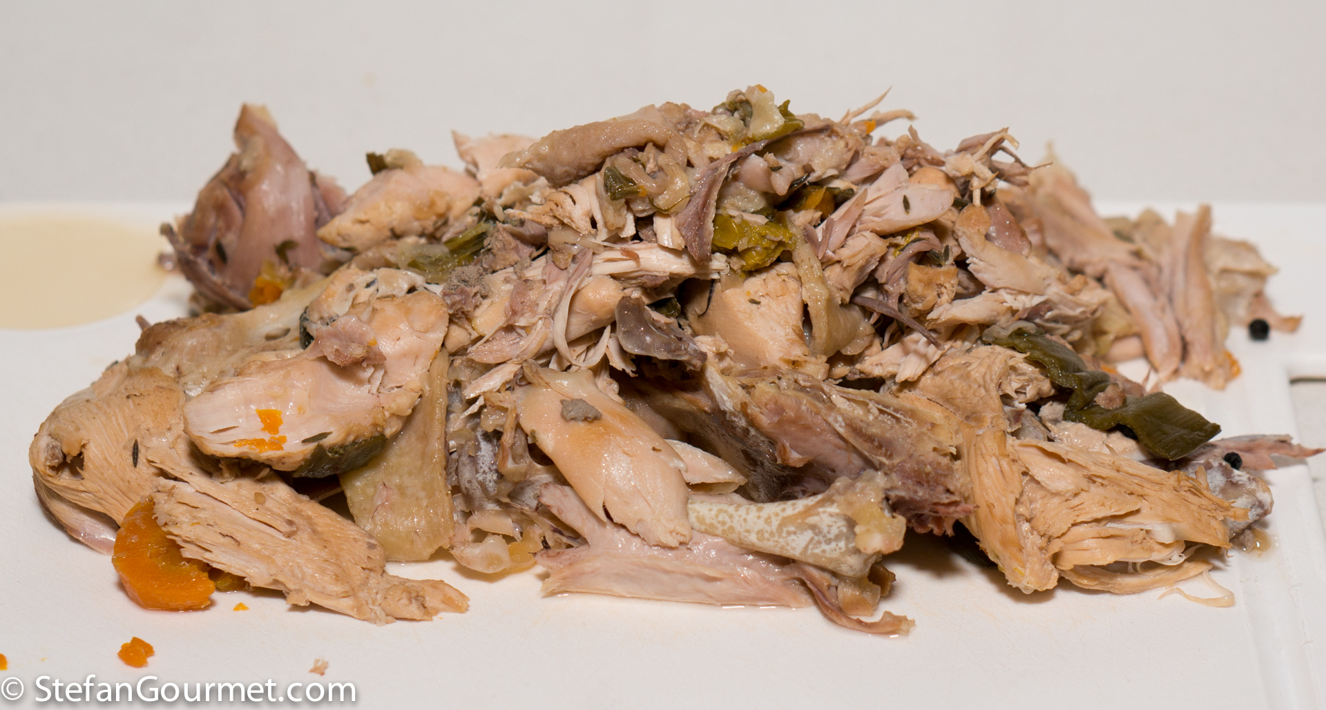 …shred the meat, season with salt and freshly ground black pepper, and reserve.