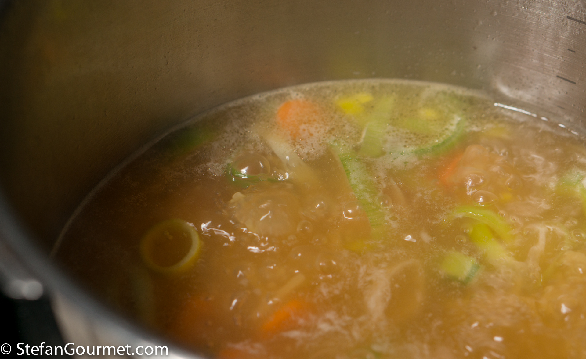 The noodles used in soup in the Netherlands are called vermicelli. That sounds Italian and it is — vermicelli are the same shape as spaghetti, but in the Netherlands vermicelli for soup are made from soft wheat rather than durum wheat, and they are broken into short pieces of about 2 cm (1 inch). Here I’ve used spaghetti broken into pieces, which is funny because cutting spaghetti would usually mean banishment from my dinner table 😉