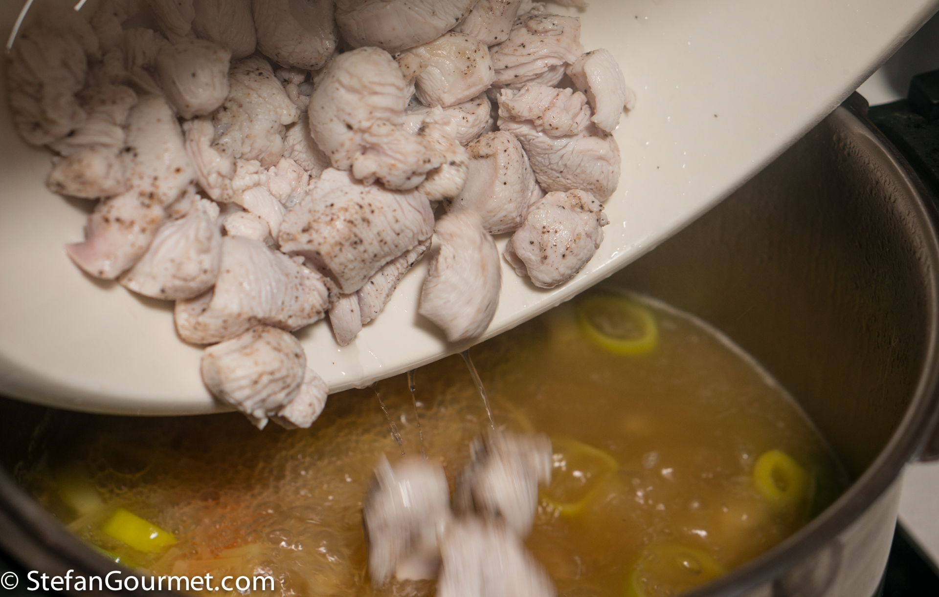Meanwhile, cut the breast meat into 1.5 cm (1/2 inch) cubes and season with salt and freshly ground black pepper.