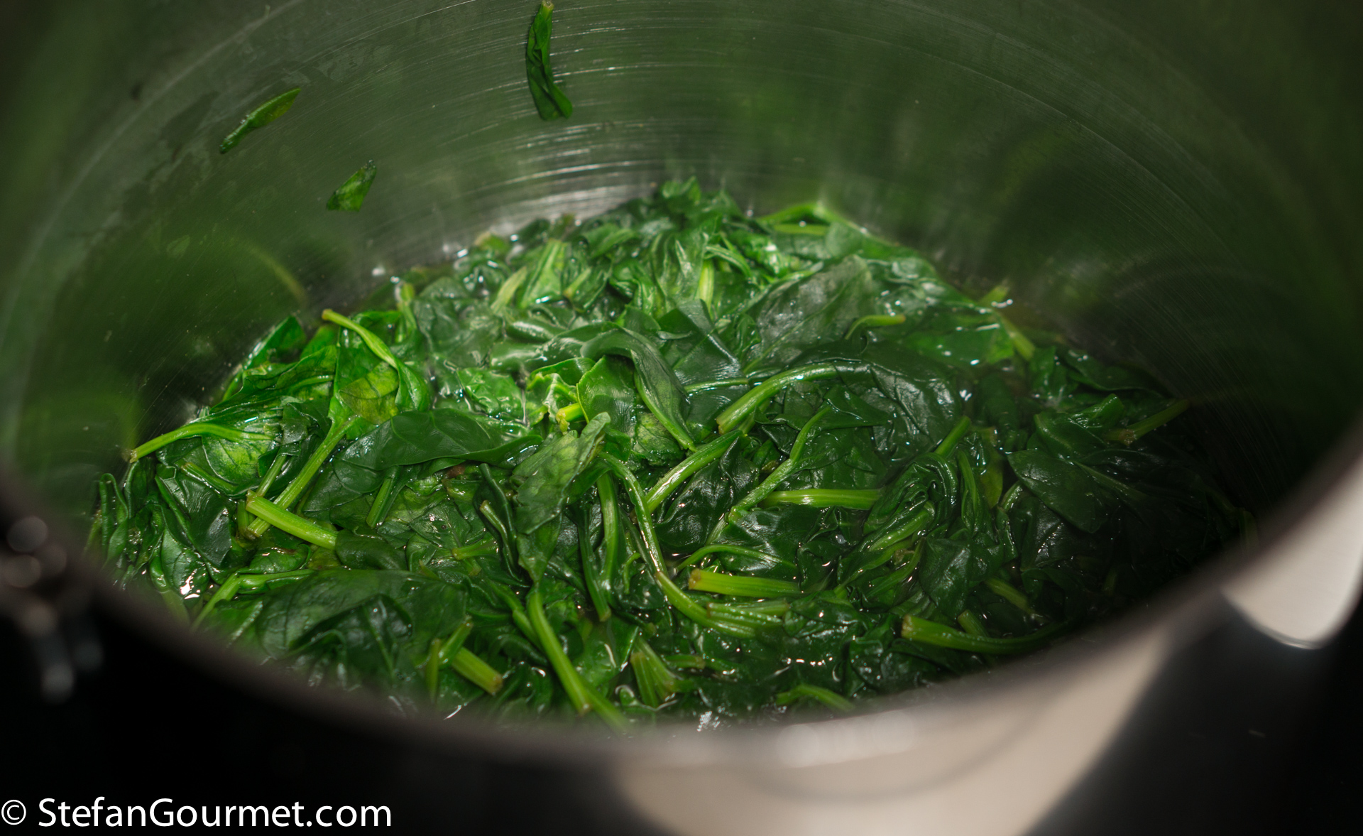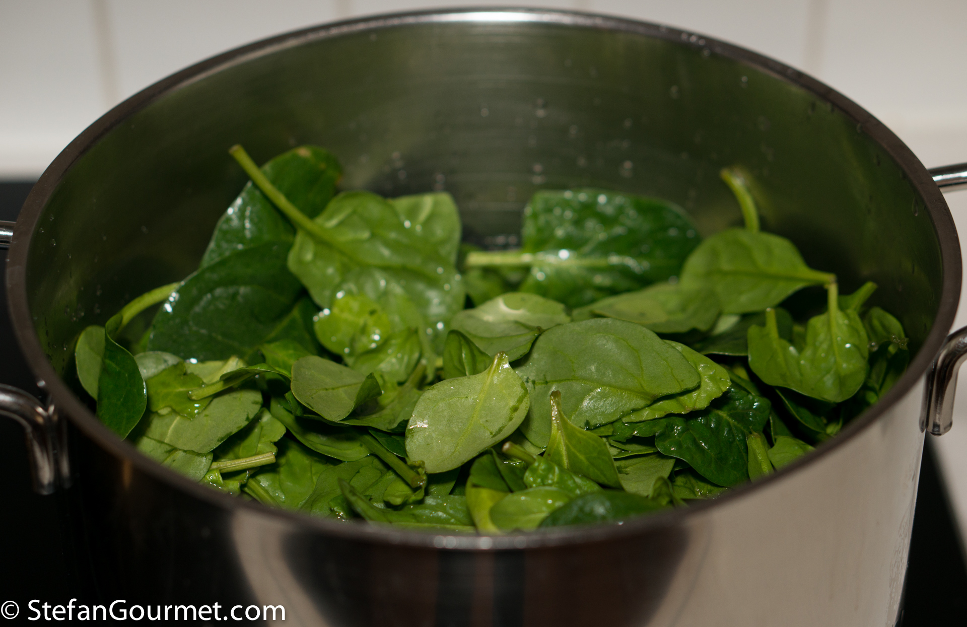 Wash the spinach and put it in a large pot with the water that clings to the leaves (aanhangend water in Dutch).