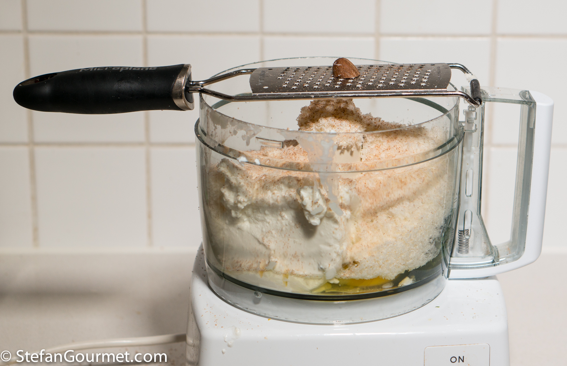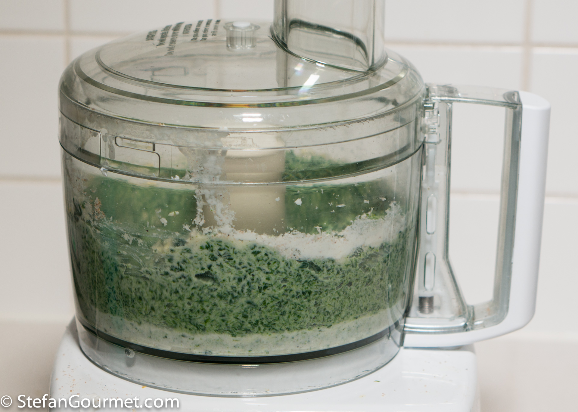 Put the spinach in the food processor or blender together with 250 grams ricotta, 100 grams parmigiano, 1 egg, freshly ground black pepper, 3/8 tsp salt, and freshly grated nutmeg.