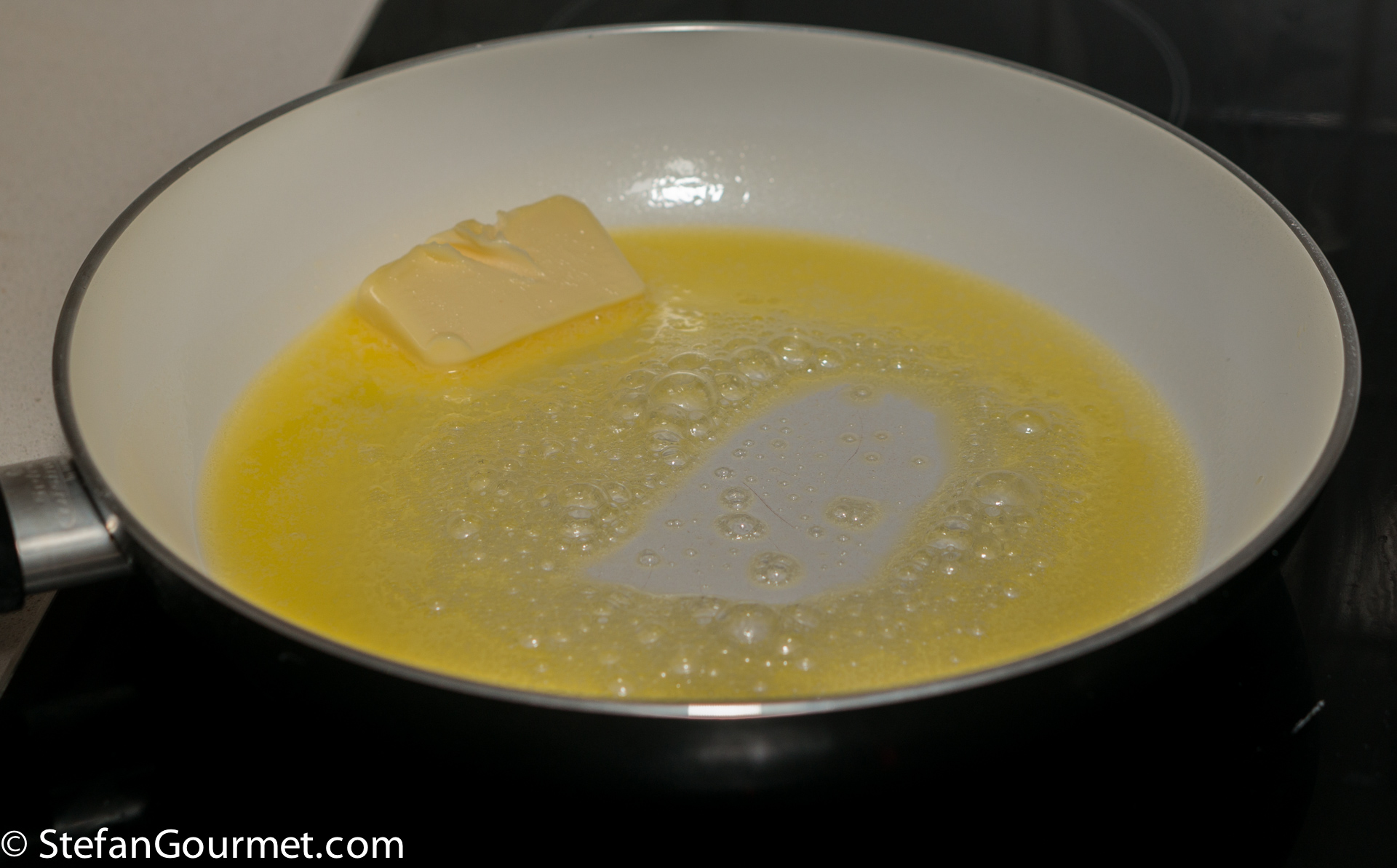 Bring a large pot of water to a boil. Meanwhile, melt a generous amount of butter in a frying pan, at least a tablespoon per serving.