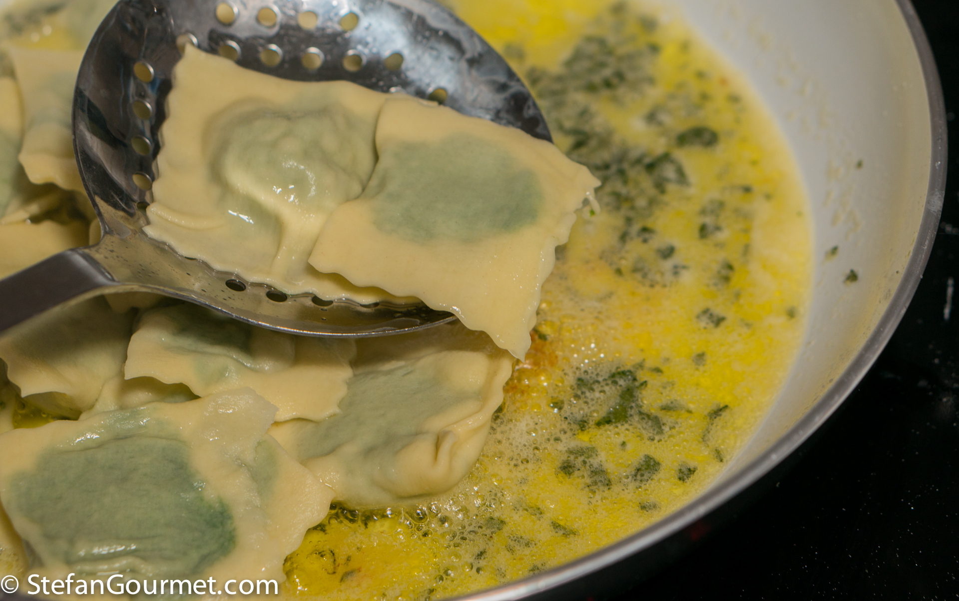 When the ravioli are done, lift them out with a slotted spoon and add them to the sage butter. When you have added all of them, gently toss them to coat them evenly with sage butter.